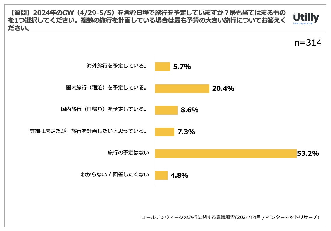 Q. 2024年のGW(4/29-5/5)を含む日程で旅行を予定していますか?最も当てはまるものを1つ選択してください。複数の旅行を計画している場合は最も予算の大きい旅行についてお答えください。