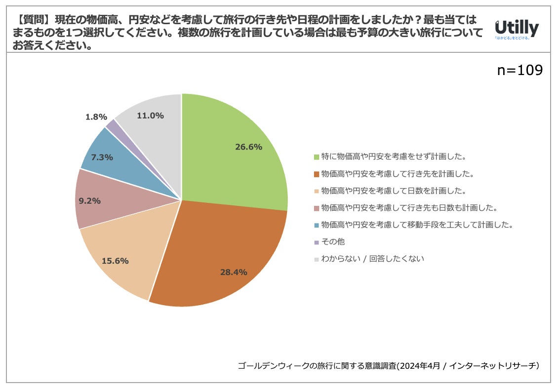 Q. 現在の物価高、円安などを考慮して旅行の行き先や日程の計画をしましたか?最も当てはまるものを1つ選択してください。複数の旅行を計画している場合は最も予算の大きい旅行についてお答えください。