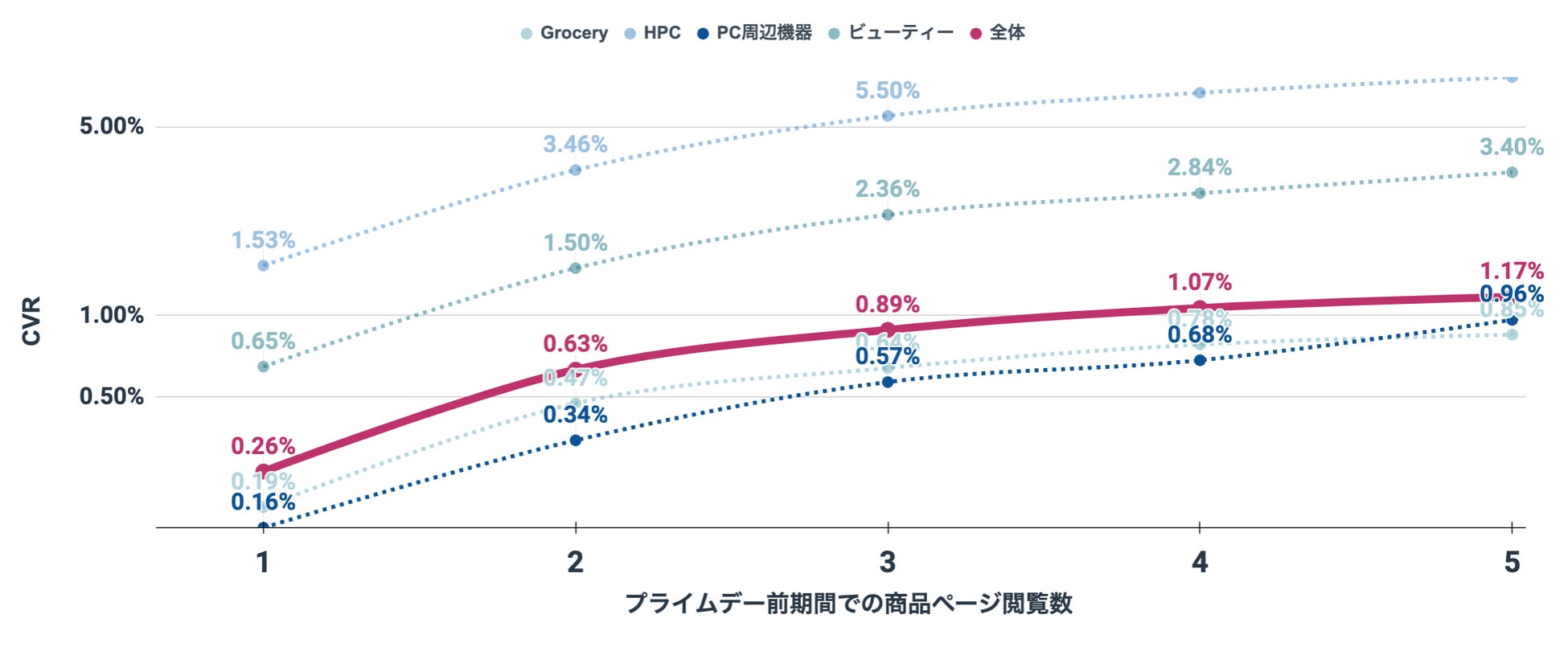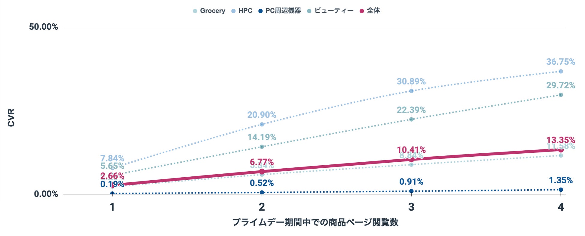 また、以下の図の通りカテゴリ別に見ても、プライムデーの期間前に複数回商品ページを閲覧するほど注文率が高く推移することがわかりました。特に、Beauty、HPC(ヘルス&パーソナルケア)の上り幅が大きいのは、買い回りが多い商材のためだと推測できます。