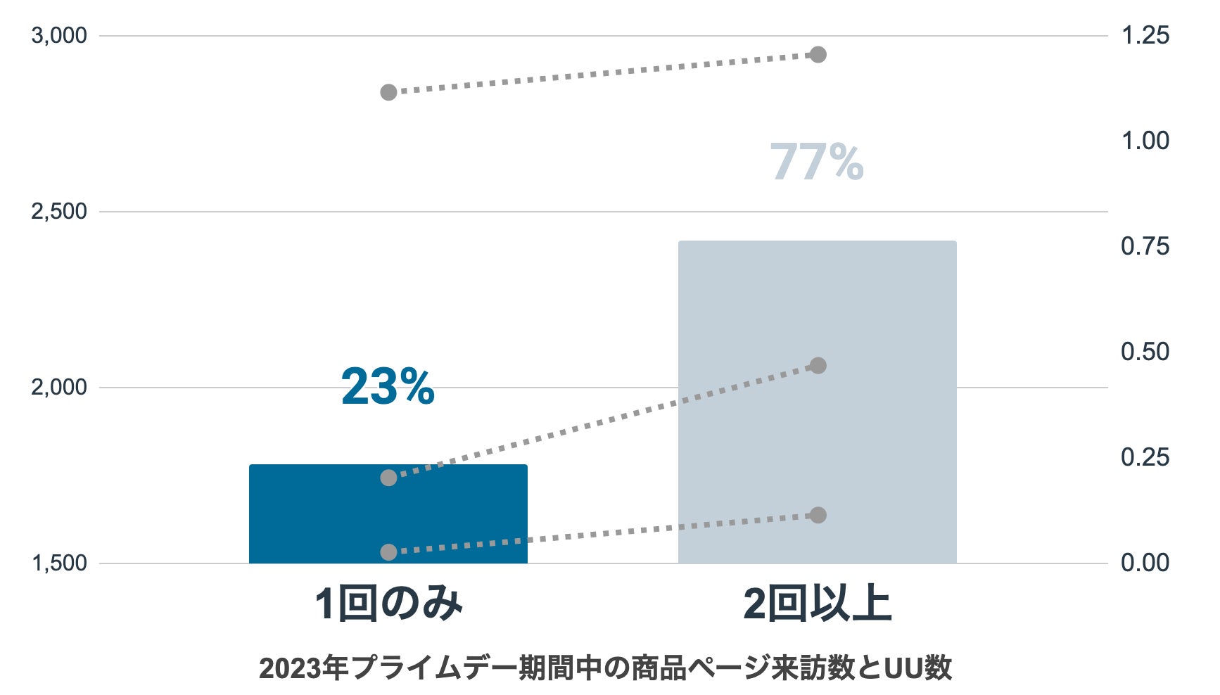 プライムデー期間中に購入したユーザー数のうち77%は2回以上商品ページを見ていることがわかりました。2回以上に閲覧を引き上げることで、注文点数・単価がアップし、さらなる売上アップに繋がる可能性があると言えるでしょう。