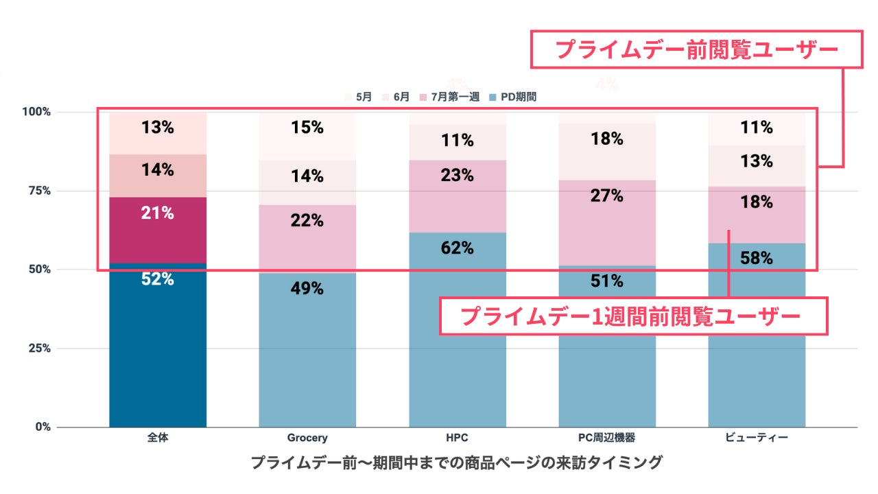 プライムデーで購入したユーザーの48%は、プライムデーより前に初回閲覧をしていることがわかりました。特に購入ユーザーの20%程度はプライムデーの1週間前から下見をしています。