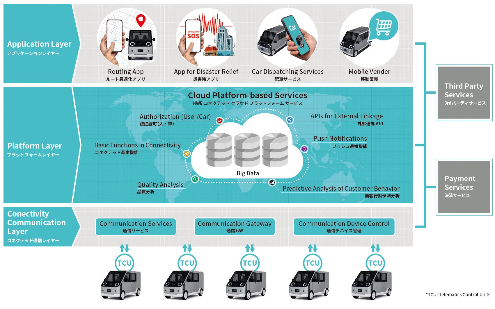 HW ELECTROのプラットフォームサービスは、車両とインターネットをつなぎ、災害支援や配送領域の最適化をはじめとした利便性の高いDX 環境の提供を目指したサービス基盤となります。車両データはネットワークを通じプラットフォームに蓄積され、プラットフォーム上で解析されたデータは様々なアプリケーションやシステムと連携し、新たなサービスとして価値を生み出します。