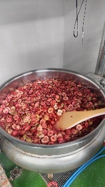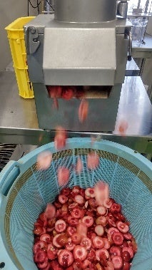 研究に用いるのは「酵素処理技術」。酵素は、物質の化学反応を促す触媒の働きをするタンパク質の一種で、生物の体内で作られており、食べたものを消化したり、代謝反応を触媒したり、人間の体が機能するために必要不可欠な物質です。物質化学科生物化学研究室では、長年キノコ菌が生産する酵素の基礎研究を行ってきており、その応用として今回の技術開発が生まれたものです。従来では抽出効率が悪かったものを、酵素を使用することにより各段に効率がアップします。またリンゴのポリフェノールは、大変分解されやすいのですが、本技術によりその課題が克服されました。本技術はリンゴ以外のあらゆる果実や野菜類に応用可能です。飯綱町に酵素処理技術について技術指導した上で、特許「特許第6391020号:天然色素抽出液の製造方法(一般社団法人長野県農協地域開発機構と共同保有)」についても使用許諾しています。