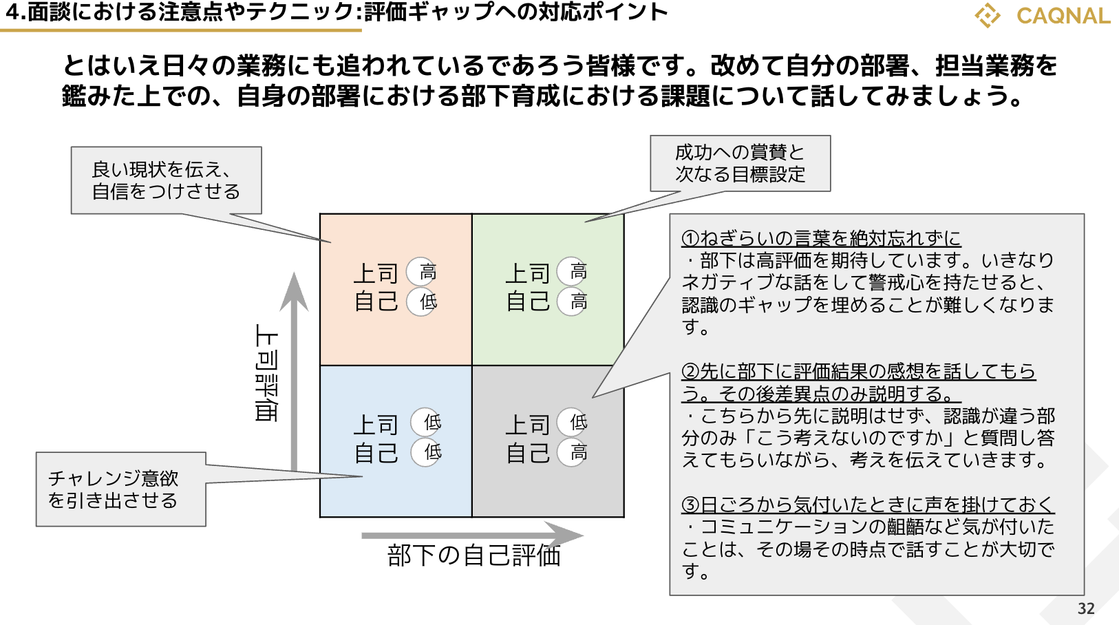 幹部職員向けマネジメント研修では、主に幹部育成における効果と難点も提示しながら取り組む重要性を改めて認識いただきました。その上で、中間評価面談時の時間の使い方や面談の実施場所や座る位置、姿勢などノンバーバルな部分も含めたコミュニケーションスタイルを改めて見直し、避けた方がいい質問など具体的な面談の実施イメージをつかめるような内容にいたしました。特に必ずと言っていいほど生まれる部下自身の自己評価と上司からの評価ギャップに応じた面談ノウハウをお伝えしております。