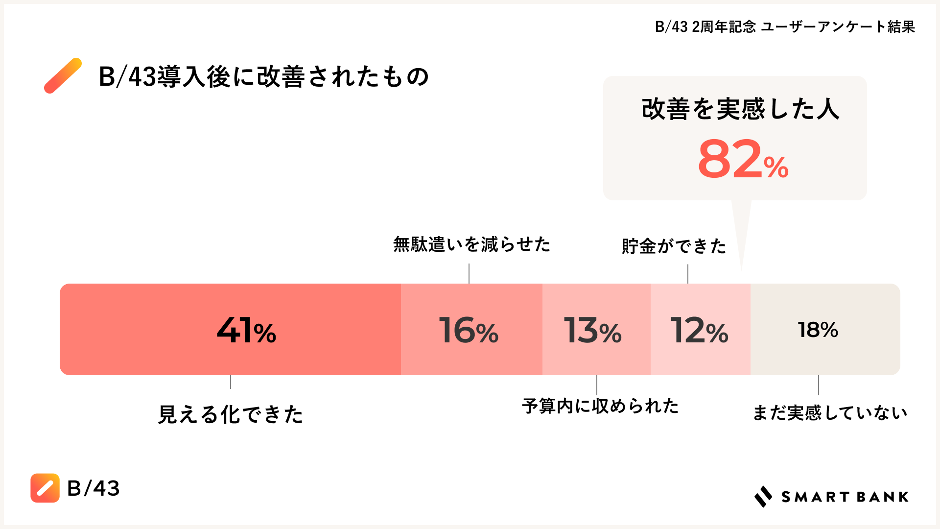 「B/43(ビーヨンサン)」は、チャージ式のカードにふたりで入金すると、リアルタイムに支出が可視化される新しい家計管理サービスです。B/43を利用すると、支出の見える化や無駄遣いを減らせるなど82%の人が家計改善の効果を実感しています。(※2)