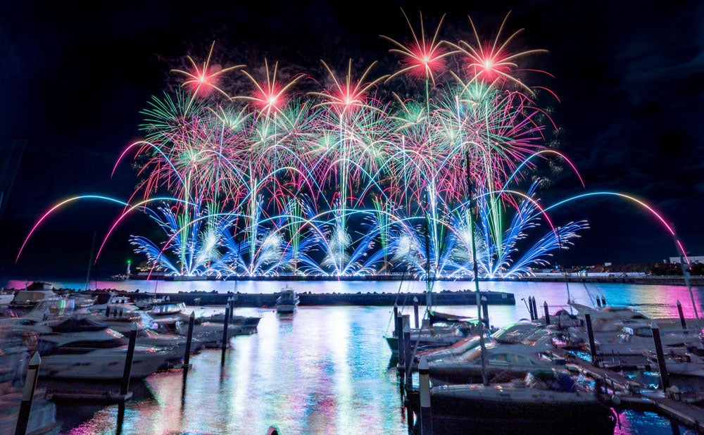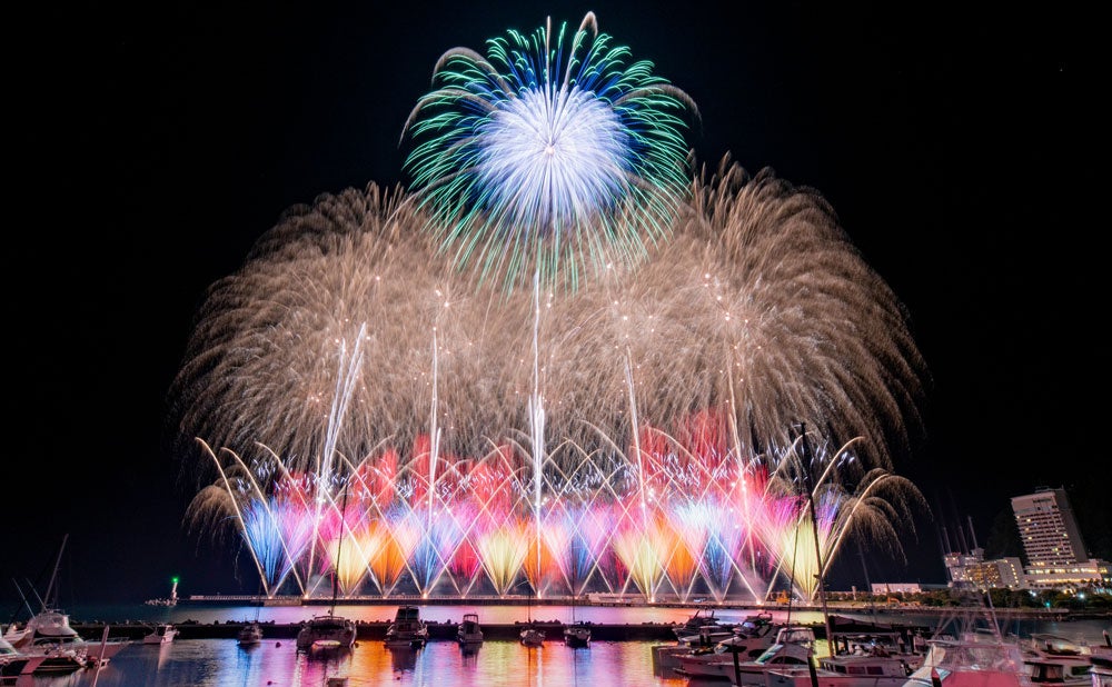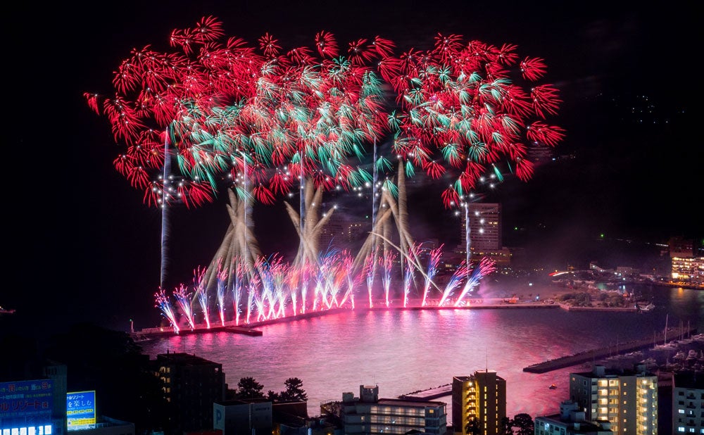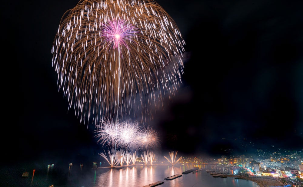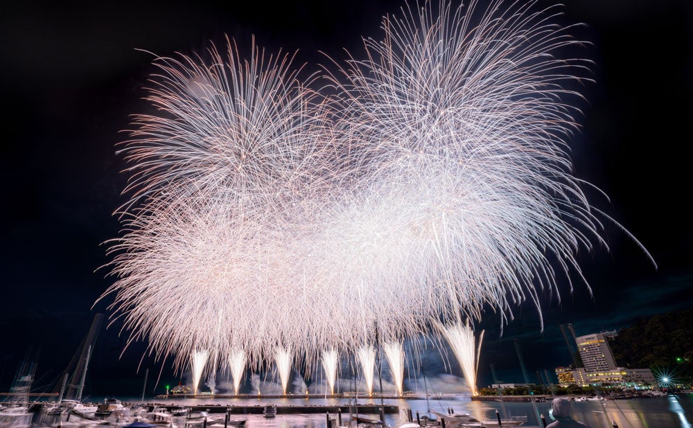 熱海海上花火大会は、1952年(昭和27年)にはじまった歴史ある花火大会。夏だけではなく年間を通して15回以上も開催されている熱海名物の花火大会です。夜空に広がる花火や、水面に映る花火、そして、フィナーレを飾る「大空中ナイアガラ」の美しさは、瞬きを忘れるほど!心にずっと残る思い出ができる、熱海海上花火大会ならではのイベントです。