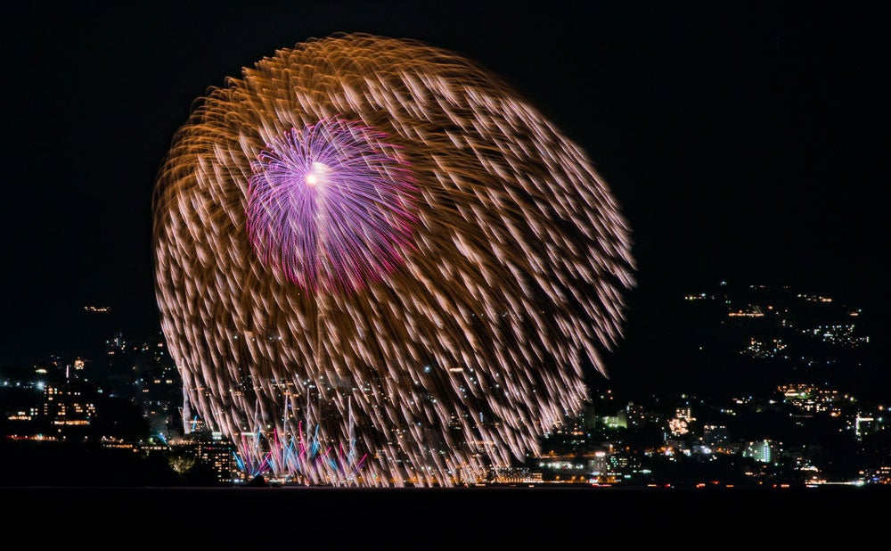 また、会場である熱海湾は花火業者さんも絶賛する、日本一の花火打上会場!三面を山に囲まれた「すり鉢」状の地形のため、海で上げる花火の音が反響し、大きなスタジアムのような音響効果があります。親水公園など、海の近くでご覧いただくと、大きな単発や「大空中ナイアガラ」は、体にまで音が伝わってきます。見るだけでなく、体感していただく花火です。この他、会場を最大限に活かした、熱海ならではの構成で花火をお楽しみいただきます。