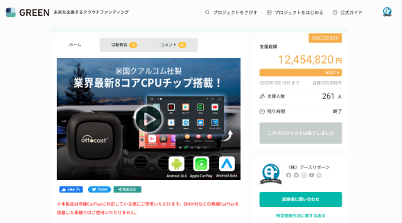 2022年にGREEN FUNDINGで前作の「OTTOCAST-S31」のクラウドファンディングを行い、261名様から合計12,454,820円のご支援をいただきました。