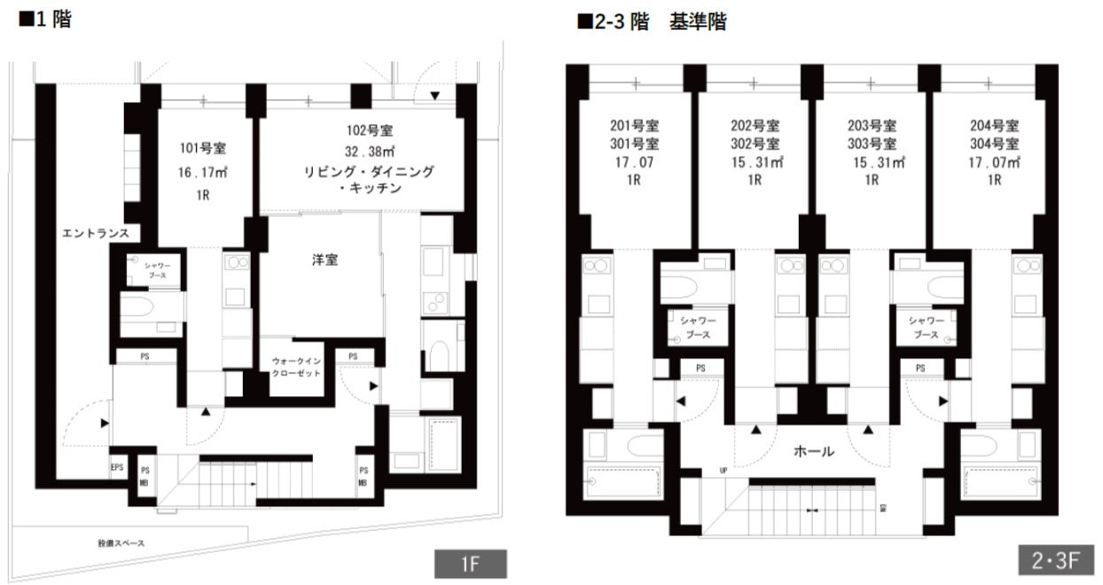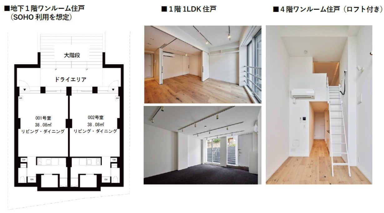 ワンルームは全戸に道路に向けた大型の窓を設け、一年中安定した光がさす快適な住空間を実現。⽔回りを効果的にコンパクト化しながら居室スペースを最⼤限に確保し、ロフトを設置(一部住戸)するなど、15~17平米というミニマルな住空間でありながら⼀⼈暮らしをサポートする機能的な空間づくりを追求しています。