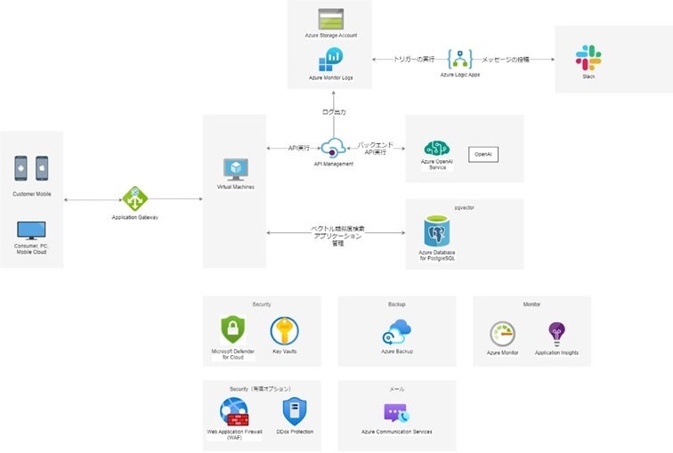 今回リリースされた「HEROZ ASK」は、Azure OpenAI Service だけでなく、Microsoft Azure上の様々なPaaSを活用いただいたアーキテクチャになっています。外部チャットツールとの連携やメール配信通知機能を備えているほか、Microsoft Defender for Cloudなどを始めとするセキュリティ製品も活用いただき、エンタープライズレベルでのセキュリティが備わり、最新の機能やAIモデルを常に提供できる生成AI活用のためのプラットフォームとなっています。