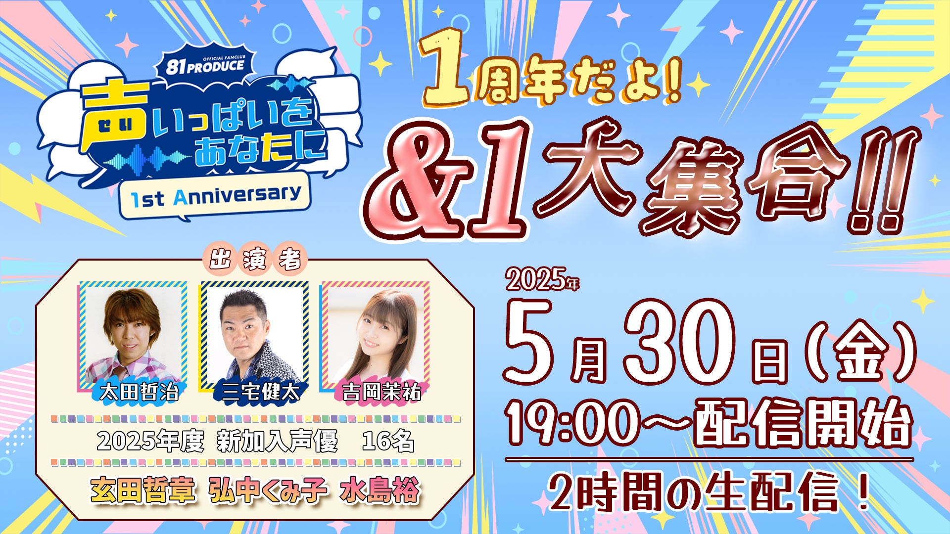 株式会社81プロデュース(本社:東京都渋谷区、代表取締役社⻑:南沢道義/以下81プロデュース)は、81プロデュース公式ファンクラブ「81PRODUCE OFFICIAL FANCLUB ~声いっぱいをあなたに~」にて、5月30日(金)19:00より2時間にわたる特別生配信『1周年だよ!&1大集合!』が決定!