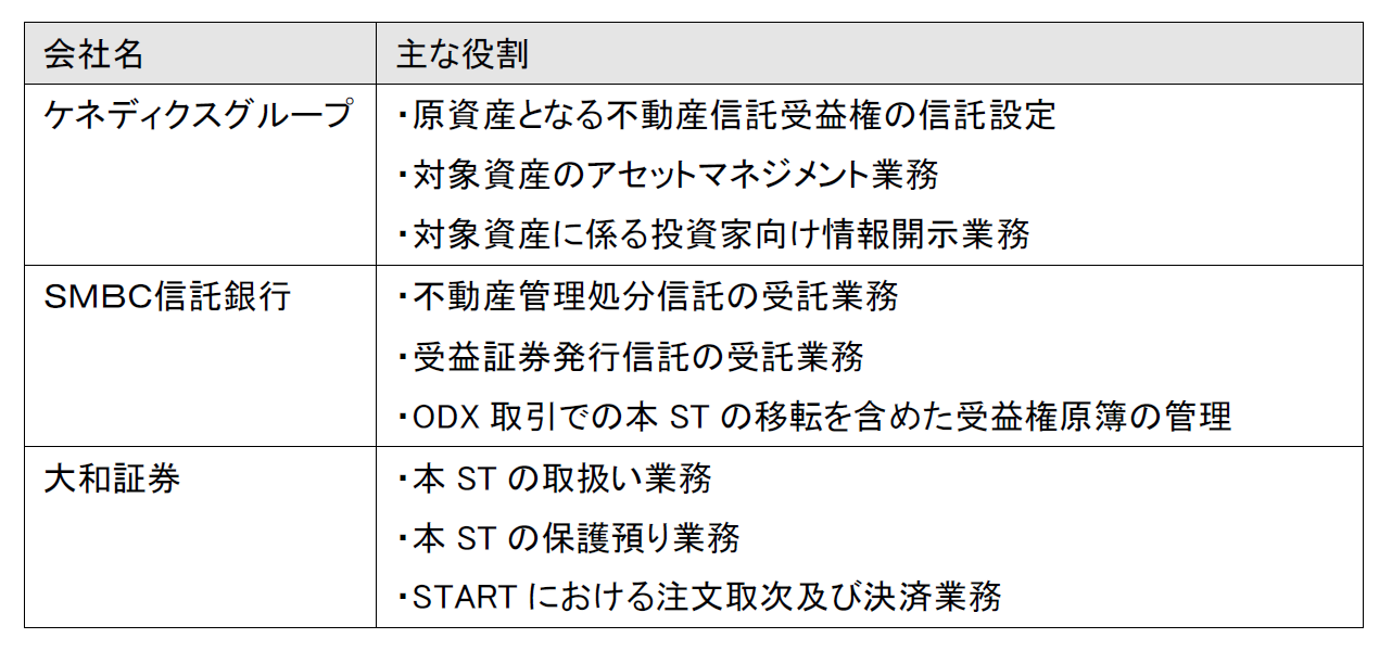 私設取引システムにおいて、本邦初で取り扱われる不動産セキュリティ・トークン・オファリングを実施するにあたり、協業各社は、以下の役割を担っています。