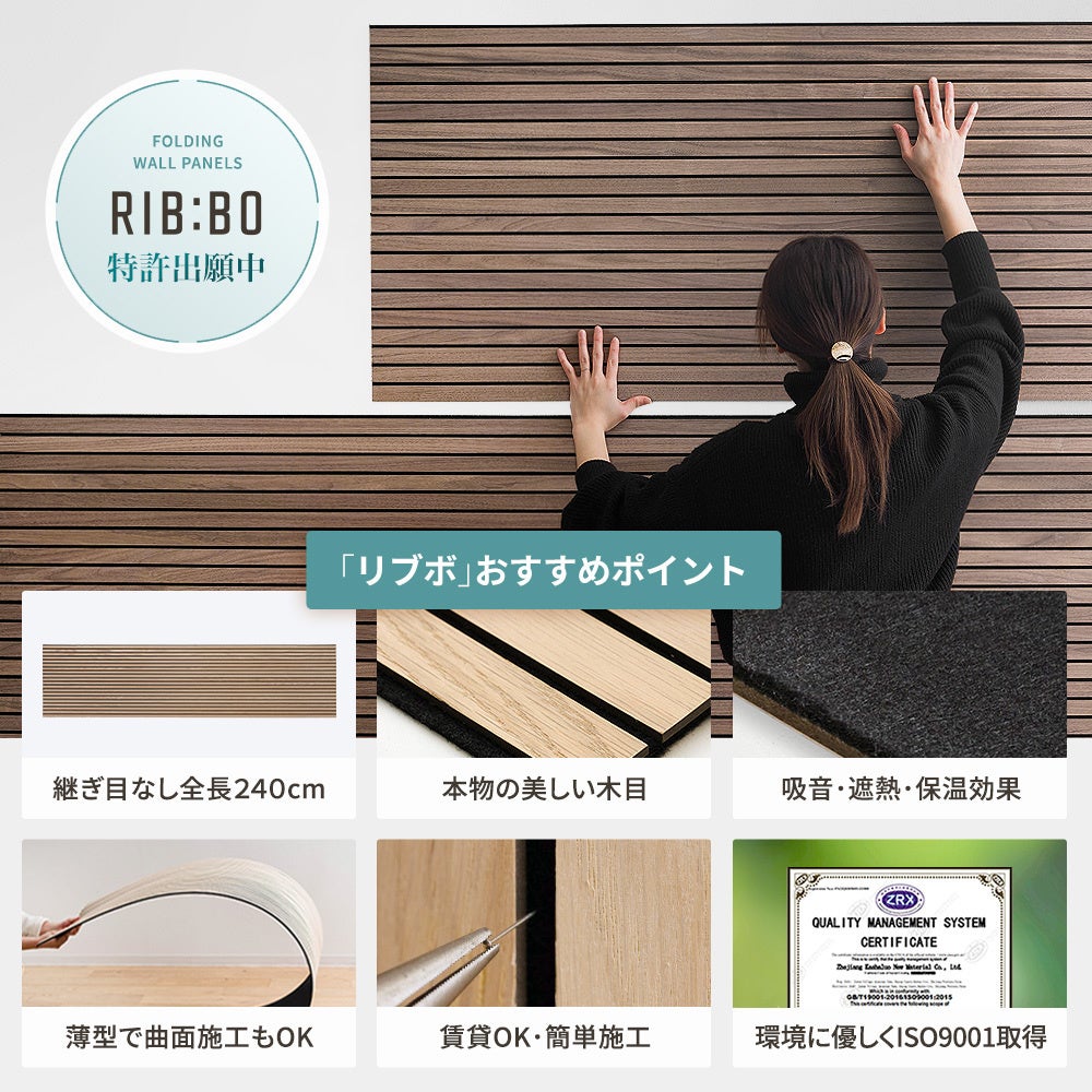 インテリア・エクステリア・DIY商材を販売する株式会社友安製作所(本社:大阪府八尾市、代表取締役社長:友安啓則、以後「当社」)は、天然の高級木を使った薄型壁パネル「RIB:BO(リブボ)」を発売しました。当社売り上げNo.1の壁材、吸音パネル「sotto(ソット)」の姉妹品であり、全長240cmの長さや、軽量・薄型の形状が特徴です。様々な空間で、より自由度の高いコーディネートをお楽しみいただけます。