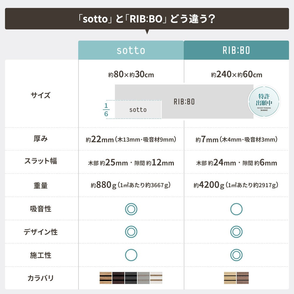 天然木を使用した装飾性のある吸音パネルとして、発売以来多くの方に選んでいただいている「sotto」。「sotto」は2023年の当社売り上げNo.1壁材です。人気のポイントは吸音性だけでなく、ホテルライクなインテリアを演出するお洒落な壁パネルとして、SNSで大きな反響をいただいています。この度発売した姉妹品の「RIB:BO」は、長さ80cmの「sotto」に対し、240cmと丈が長く、多くのシチュエーションで継ぎ目なく施工していただけるようになりました。また「sotto」と同素材の吸音フェルトを、3mmの厚みで採用した薄型タイプで、角や曲面に添わせて施工することも可能です。