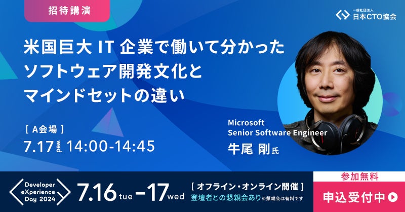 一般社団法人日本CTO協会(本社:東京都渋谷区/代表理事:松岡剛志、以下:日本CTO協会)は、2024年7月16日(火)・17日(水)に開催する開発者向け大規模カンファレンス「Developer eXperience Day 2024」のタイムテーブル27セッションを公開いたしました。また、7月17日(水)夜に開催される講演者との懇親会に参加できるチケットを、一般参加者向けに限定100枚で発売を開始しました。