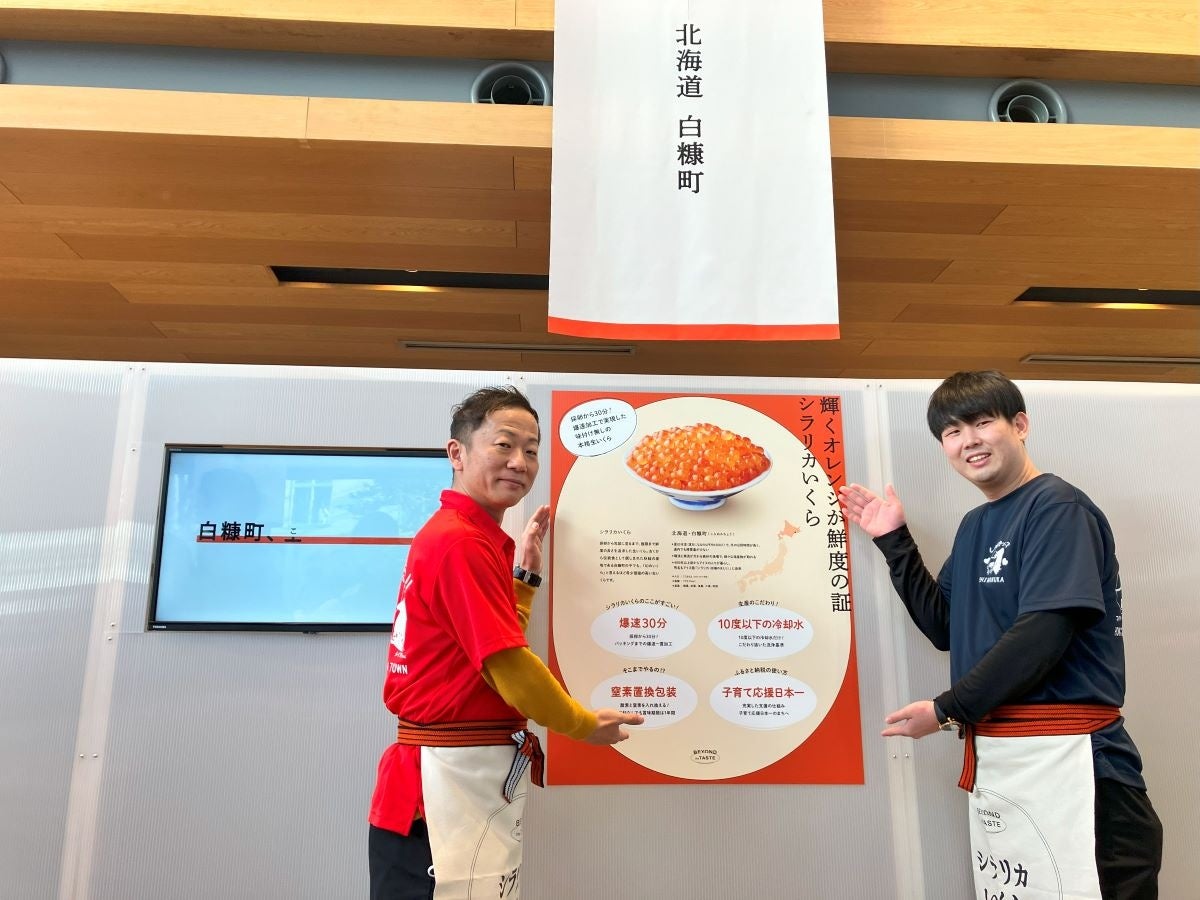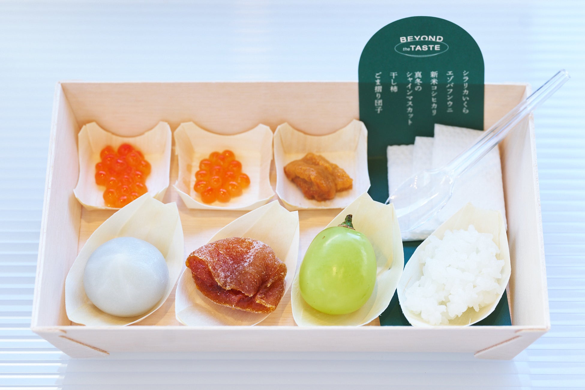 「いくら(生・醤油漬け)」「エゾバフンウニ」「コシヒカリ」「真冬のシャインマスカット」「干し柿」「ごま摺り団子」をワンプレートにして提供。会場内の順路と同じ並びに配置されています。