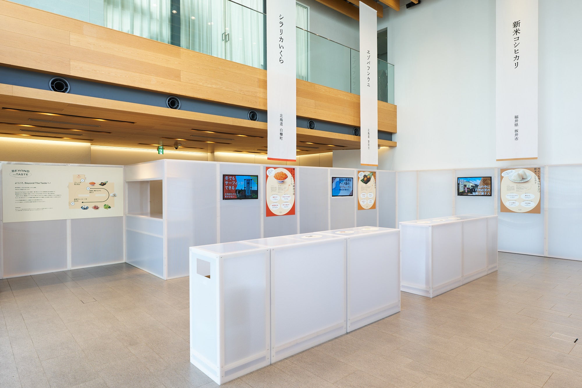 「Beyond The Taste」のキービジュアルをガラス面に大きく配しました。6自治体のふるさと納税返礼品のシズル感ある試食品写真がアイキャッチとなっています。
