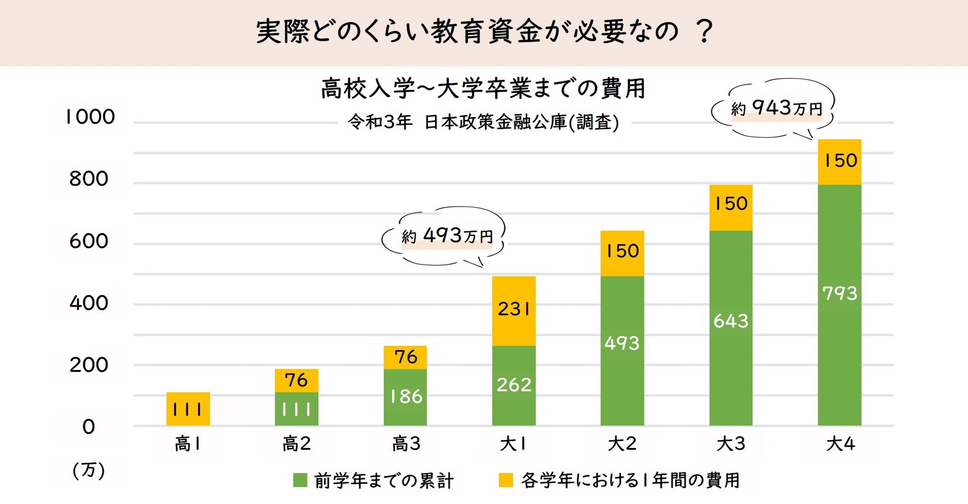令和3年、日本政策金融公庫の行った調査では、四年制大学を卒業までに必要とする学費の平均額は約943万円である。しかし、これはあくまで平均の額であり、高校と大学がどちらも私立になったり、進学塾に通ったりと、加算される要素は盛沢山だ。高校と大学、どちらも私立に進学すると、実家からの通学だとしても約1400万円が必要というデータもある。