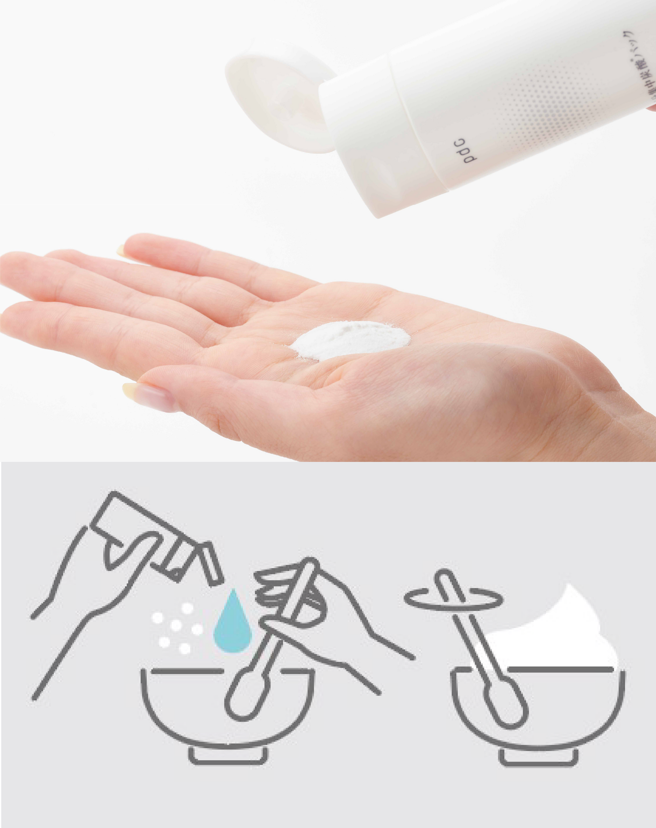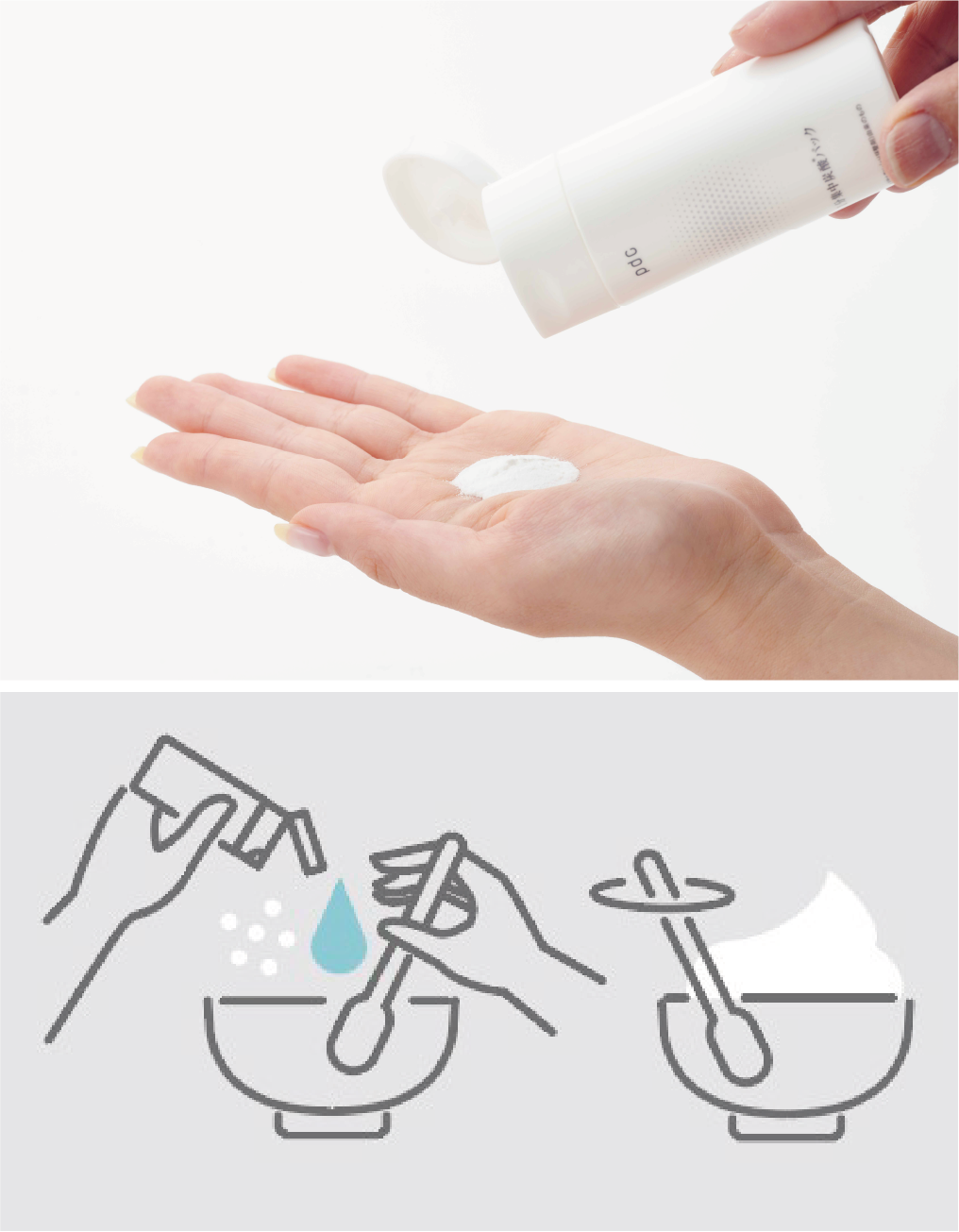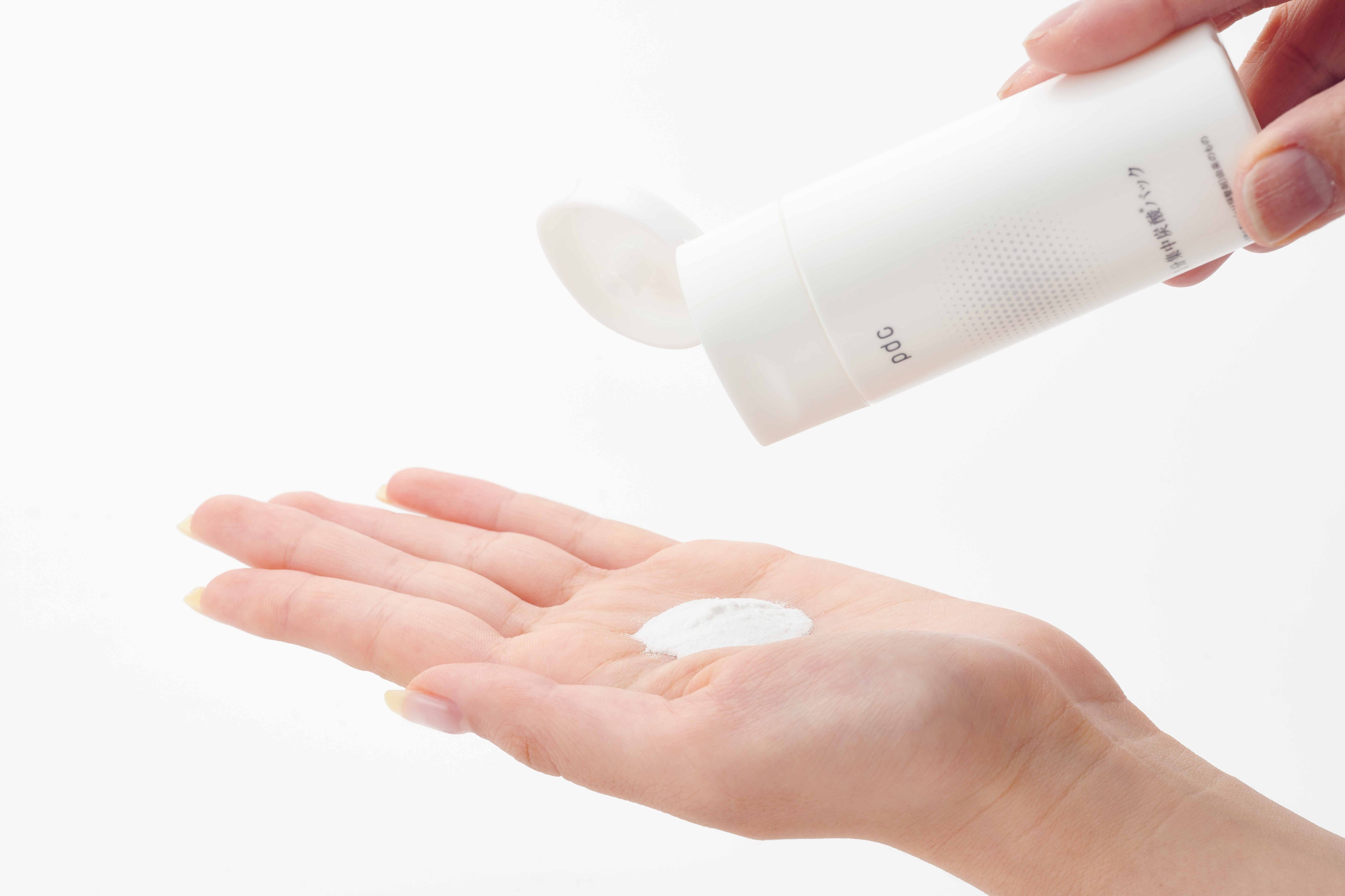手のひらにパウダーを適量(1g程度)取り出し、少量の水またはぬるま湯を加え、なめらかになるまで混ぜ合わせます(泡立ちません)。マッサージをするようにお顔全体に塗り広げ、1分おいて洗い流してください