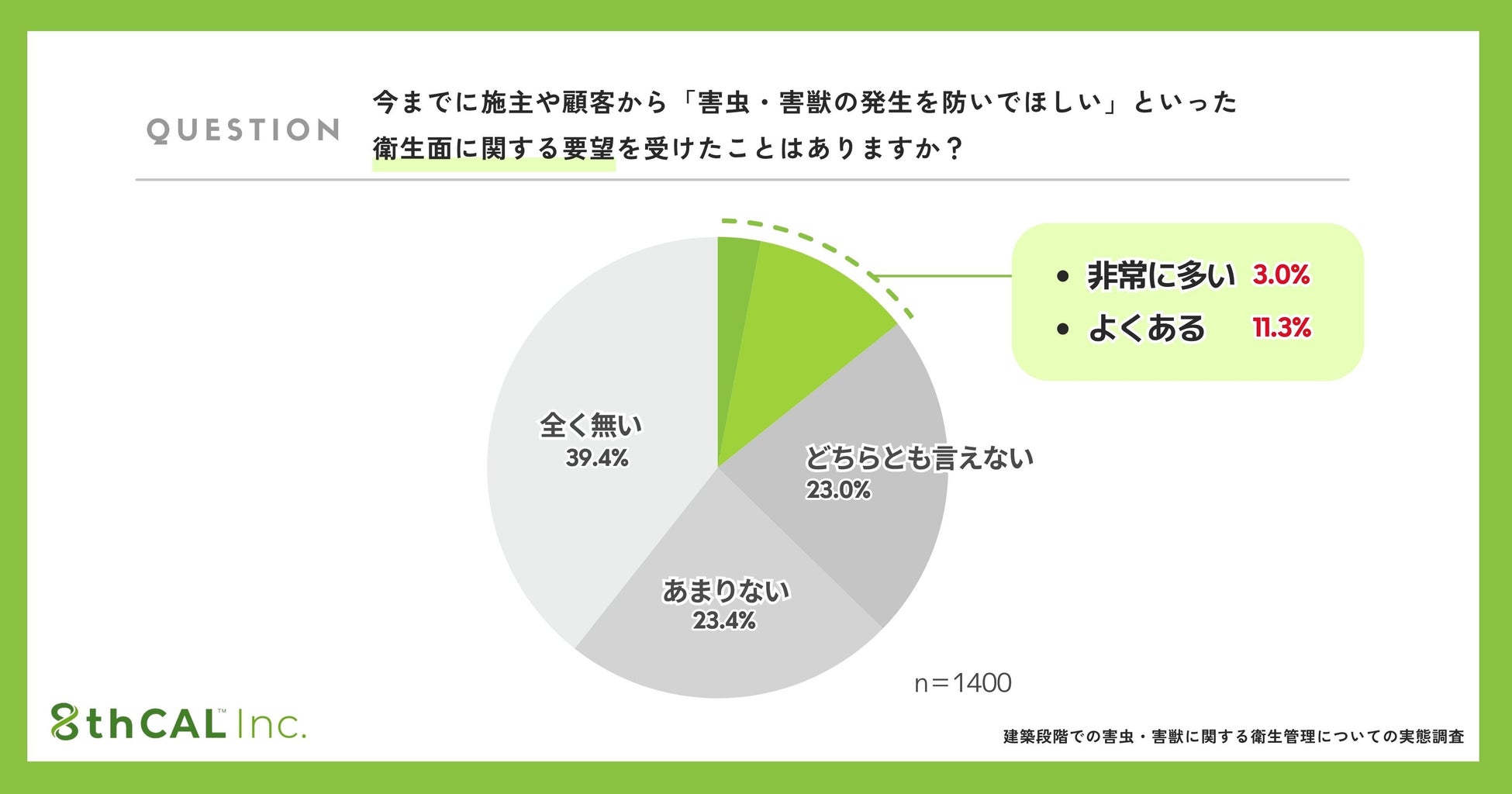 次に、建築・施工の現場において、施主や顧客から「害虫・害獣の発生を防いでほしい」といった要望を受けた経験があるかを尋ねたところ、「非常に多い」(3.0%)と「よくある」(11.3%)を合わせて、14.3%が顕在的な要望を受けた経験があると回答しました。