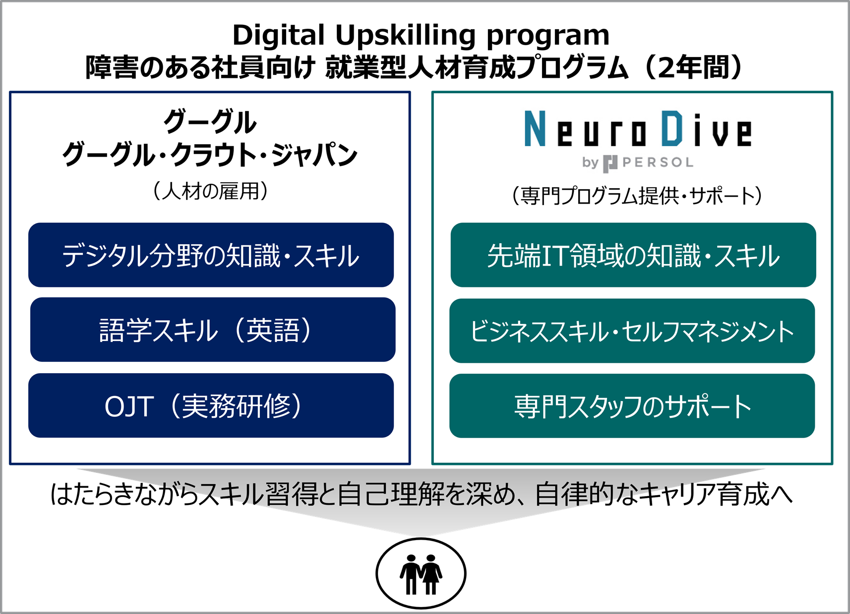 総合人材サービスのパーソルグループ傘下で障害者雇用支援事業を手掛けるパーソルチャレンジ株式会社(本社:東京都港区、代表取締役:井上 雅博、以下パーソルチャレンジ)は、グーグル合同会社(本社:東京都渋谷区、代表:奥山真司、以下グーグル)およびグーグル・クラウド・ジャパン合同会社(本社:東京都港区、代表:平手智行、以下グーグル・クラウド・ジャパン)による障害のある方向け就業型人材育成プログラム「Digital Upskilling program(デジタル・アップスキリング・プログラム)」の提供を支援します。