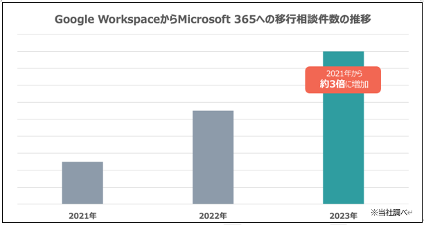当社に寄せられるGoogle WorkspaceからMicrosoft 365への移行相談は増加傾向です。2021年と比較すると、2023年はおよそ3倍以上に件数が増加しています。