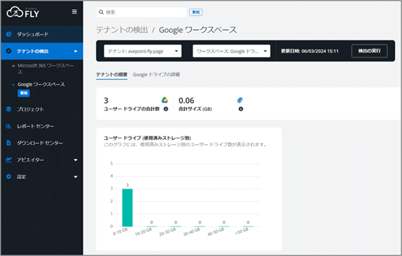 移行元の環境をスキャンし、容量やドキュメントの個数を可視化します。移行全体にどれだけ時間がかかるのか、どのオブジェクトから移行を開始するのか、といった計画立案に活用することができます。