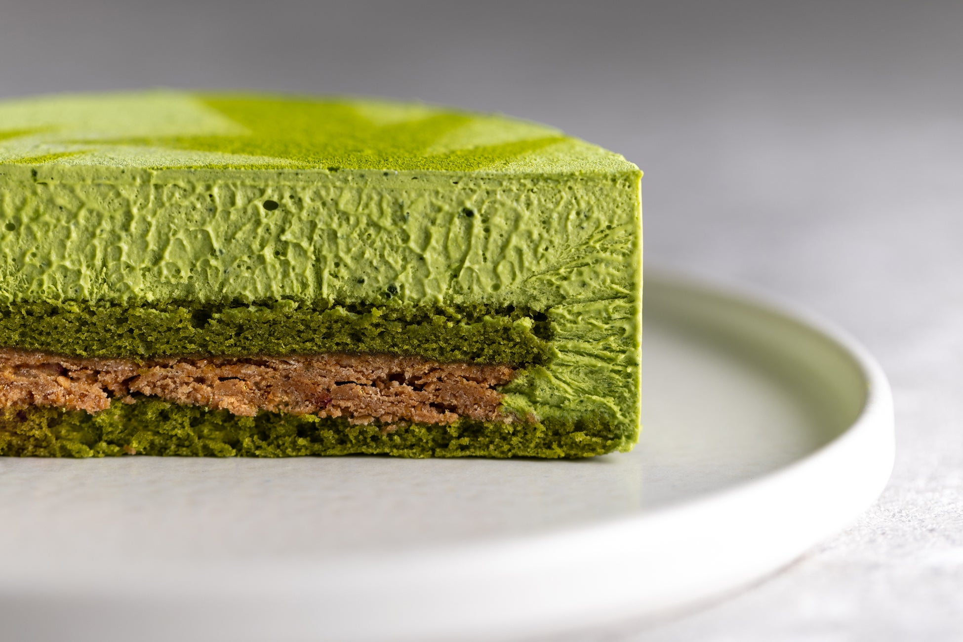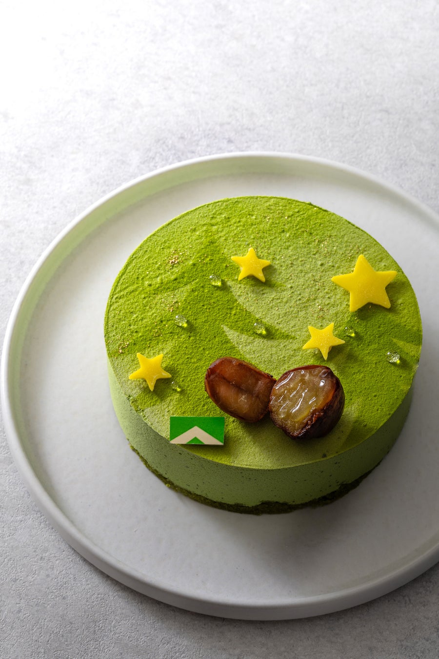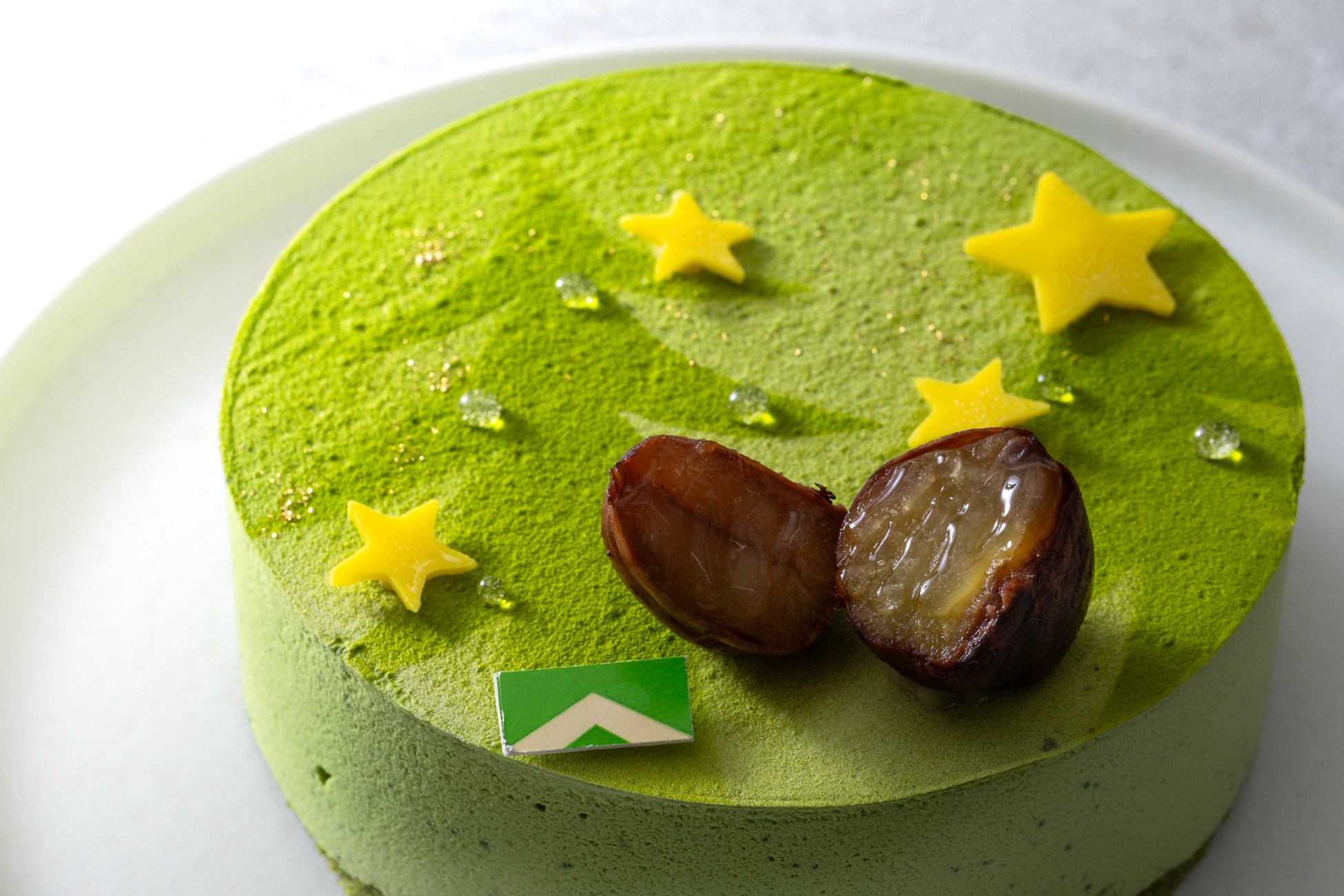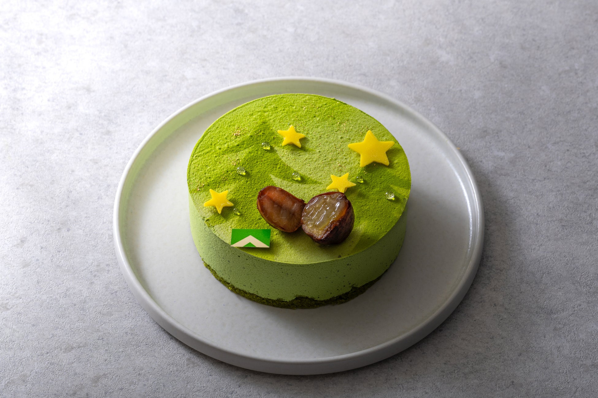 ・プレミアム抹茶の濃厚チョコレートムースとしっとりしたスポンジのコントラストが絶妙な味わいの一品。2つの抹茶の味わいを香ばしいクランチが引き立てます。チョコレートの星、ゼリーの雫、切り株に見立てた栗にデコレーションされた鮮やかな抹茶の緑に彩られたケーキでファンタジーの世界へ。