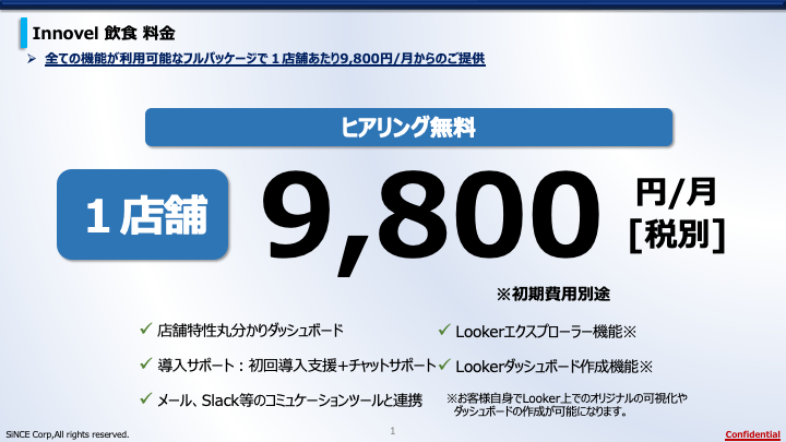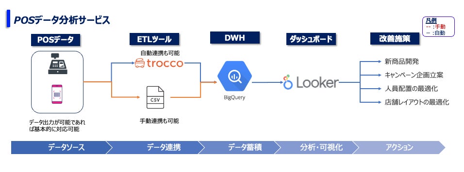 本サービスではPOSデータを分析することで、今まで勘や経験で実施していた店舗の改装レイアウトや新商品の開発、キャンペーンの企画をサポートします。また、今後は天気や気温等の情報とデータを統合することで、AIが過去のデータから需要予想や顧客特性の分類を実施する機能も実装予定です。