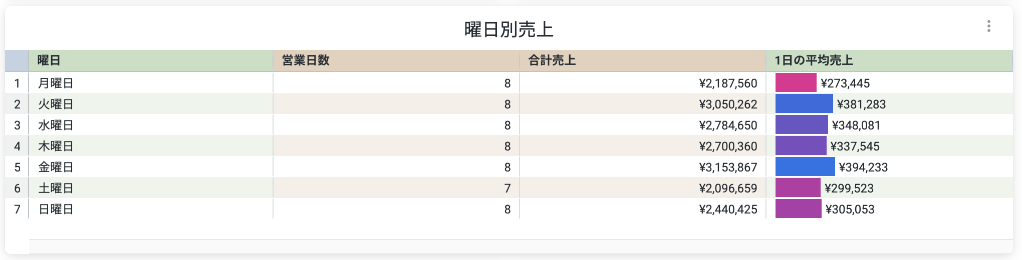 平日に強い店舗なのか、休日に強い店舗なのか、曜日の性質から、店舗の特性が見えてきます。このデータから「木曜日が弱いので、木曜限定の割引キャンペーンを実施する」といった企画が可能になります。また継続してデータを蓄積することで、キャンペーン実施前と実施後でどのように売上が変化したか分析することも可能になります。PDCAサイクルを回すことで、より意味のあるキャンペーンの企画方法が習熟できます。