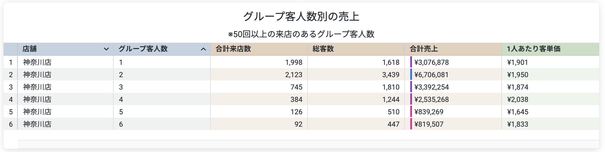 1人客なのか、グループでの利用が多いのか、グループの場合は何人での利用が多いのか視覚化が可能です。