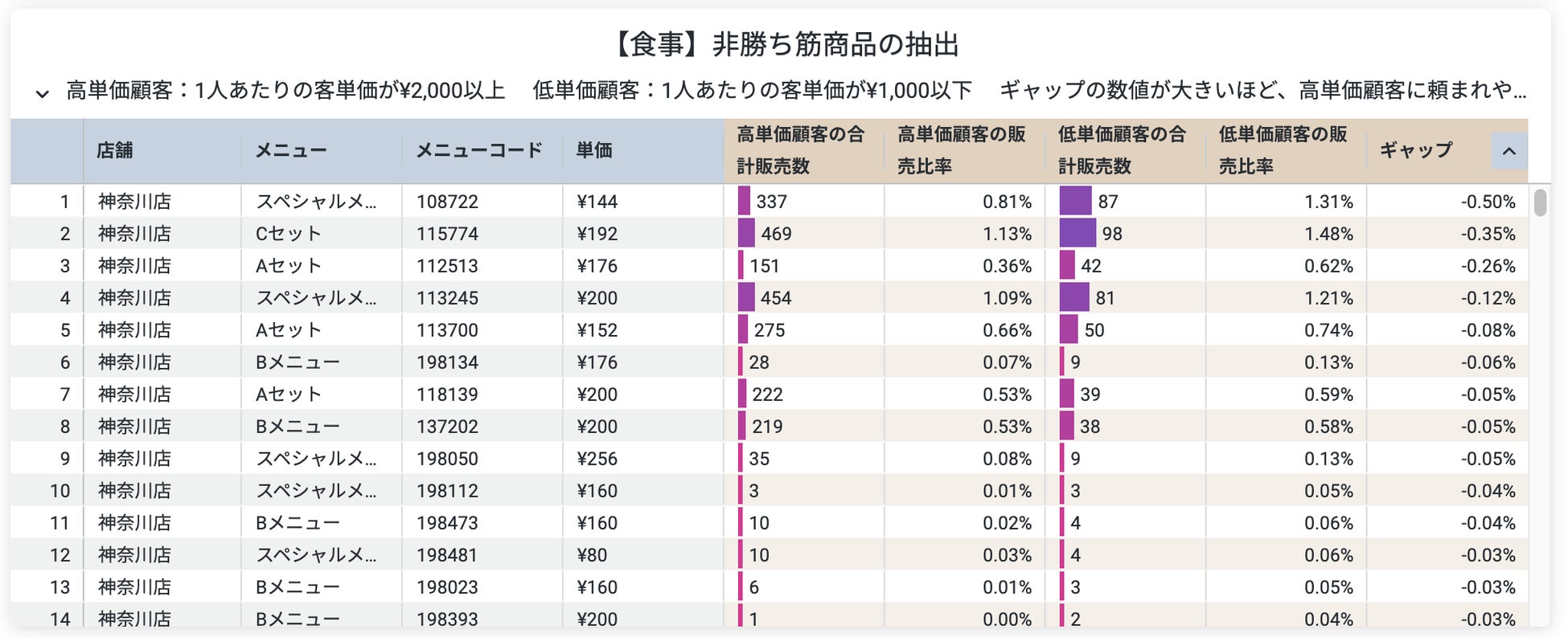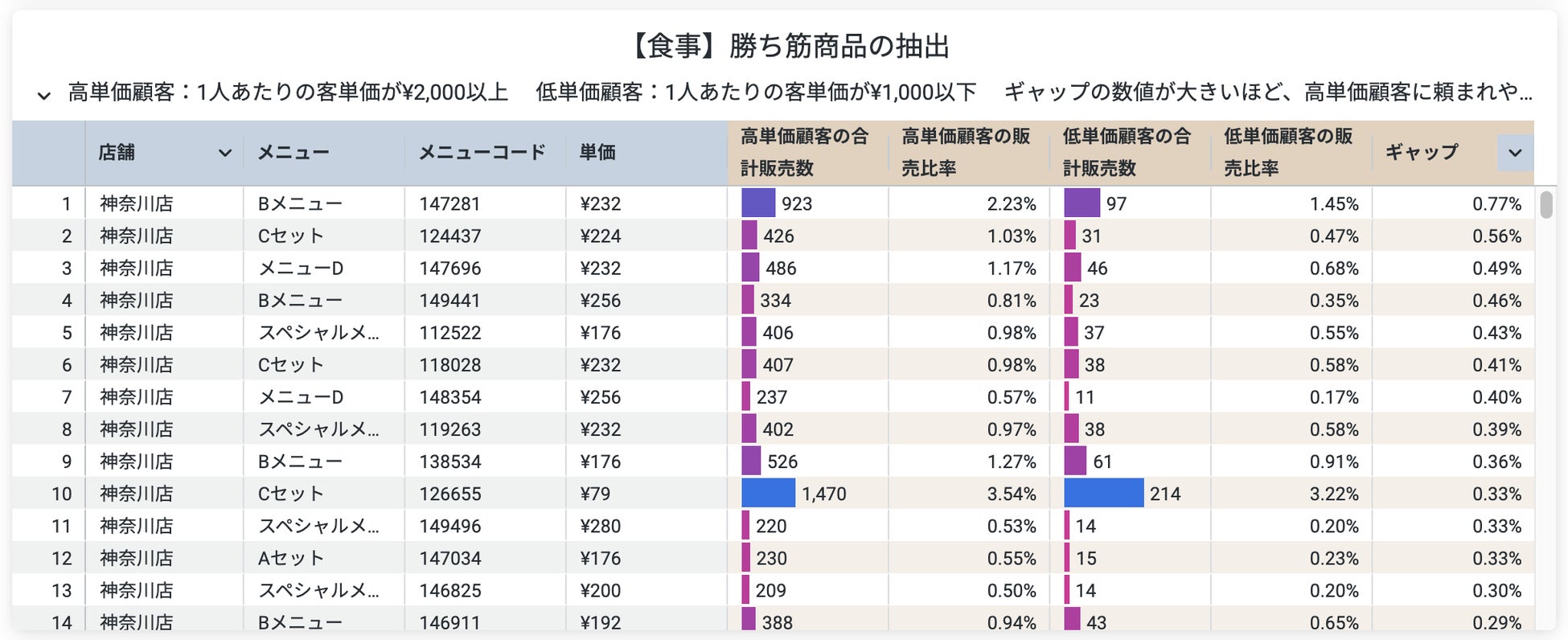 勝ち筋商品:顧客を高単価と低顧客にグループ分けを行い、高単価の顧客により多く注文される商品