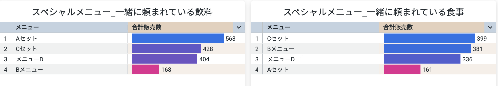 新しく開発した商品がどのような商品と一緒に注文がされているか示唆として利用することが可能です。セットで注文がされやすいメニューの開発や、セット注文を推進するキャンペーンの企画など、売上向上につながる施策の立案にご利用可能です。