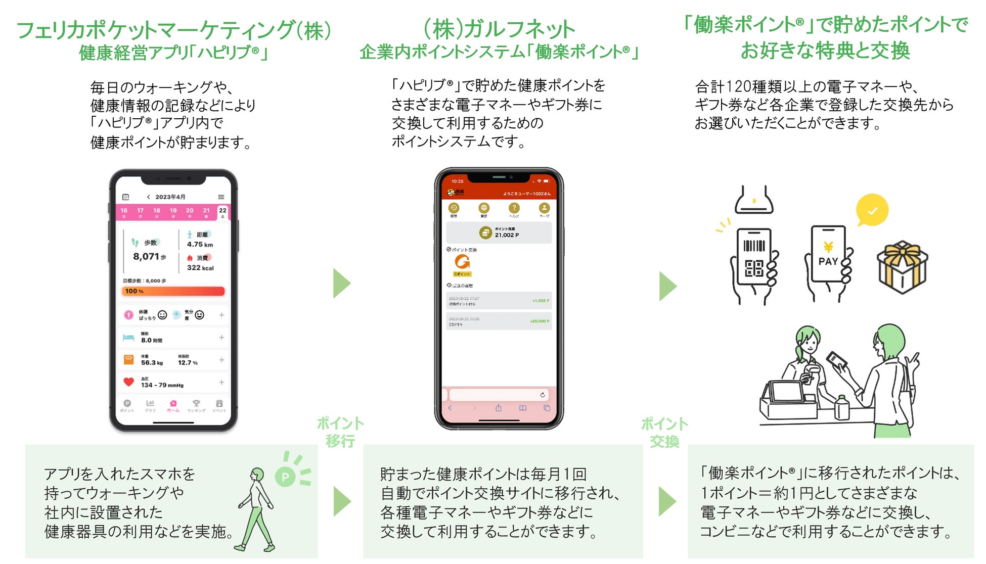 「ハピリブ®」を導入した企業の従業員が毎日のウォーキングや健康情報の記録などで貯めた健康ポイントを、株式会社ガルフネットの企業内ポイントシステム「働楽ポイント®」に連携することで、120種類以上の電子マネーやギフト券などに交換できます。