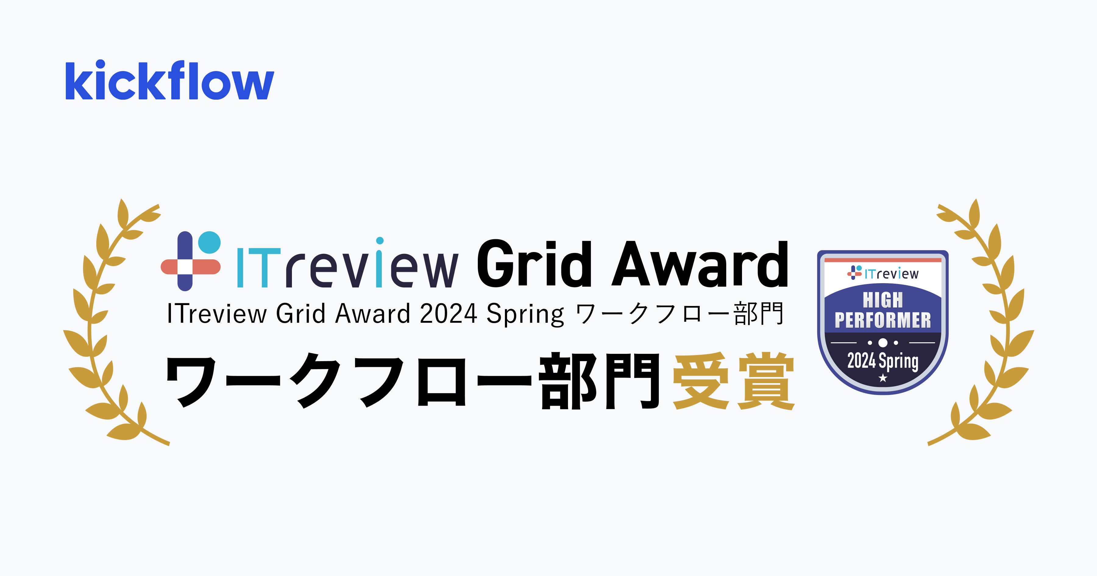 エンタープライズ企業向けクラウドワークフロー「kickflow」を提供する株式会社kickflowは、アイティクラウド株式会社(本社:東京都港区、代表取締役社長:黒野 源太)が主催する「ITreview Grid Award 2024 Spring」のワークフローシステム部門にて「High Performer」を受賞したことをお知らせします。