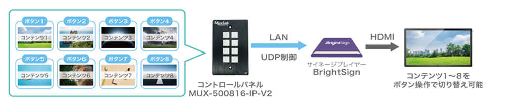 弊社では、ローコストで思い通りのデジタルサイネージを実現できるサイネージ専用プレーヤー「BrightSign」を取り扱っております。本コントロールパネルはUDP制御により、BrightSignのサイネージコンテンツの切り替えに対応します。本機とBrightSignをLAN接続し、BrightSignへUDPコマンドを送信します。BrightSignは受信したUDPコマンドをトリガーとして、コンテンツを切り替えます。コンテンツの切り替え設定は、BrightSign専用オーサリングソフトウェア「BrightAuthor」で簡単に行えます。