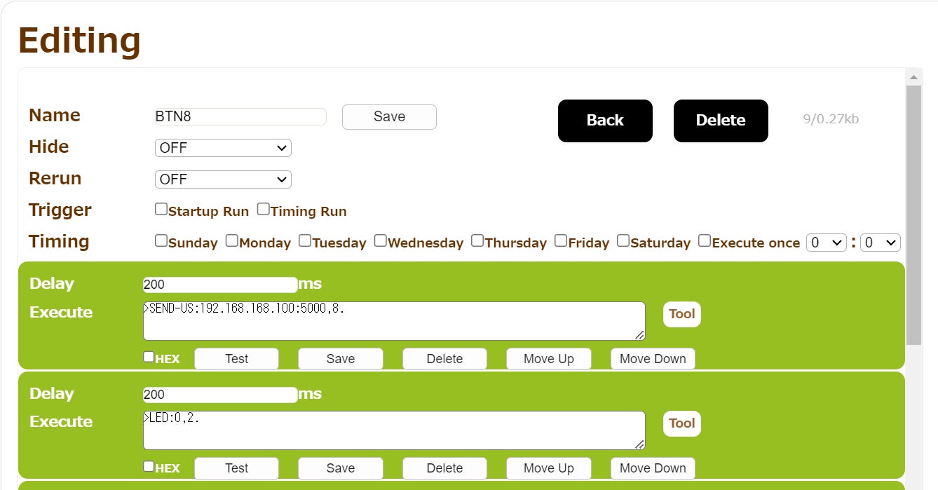 搭載している8つのボタンには、それぞれ複数のプログラムを登録できます。UDP、TCP/IP、RS-232Cの各コマンドを同時に送信する、ボタンを押下したタイミングでLEDを点灯させる、ボタン押下後の任意のタイミングでLEDを消灯させるなど、自在なプログラミングをWeb UIで簡単に行えます。