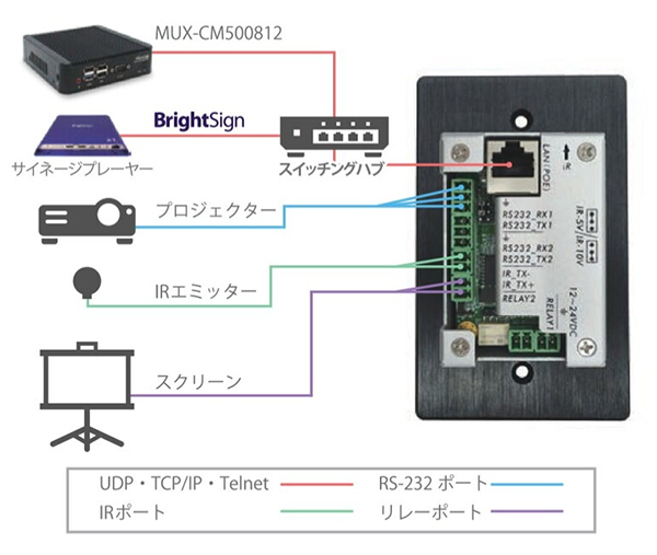 UDPを利用して、サイネージプレーヤー「BrightSign」や、TCP/IP (PJ Link)によるプロジェクターの遠隔制御が可能です。また、RS-232Cに対応するスイッチャー、ディスプレイ、プロジェクタースクリーン、PC、AVソース機器などの他社製機器も制御できます。