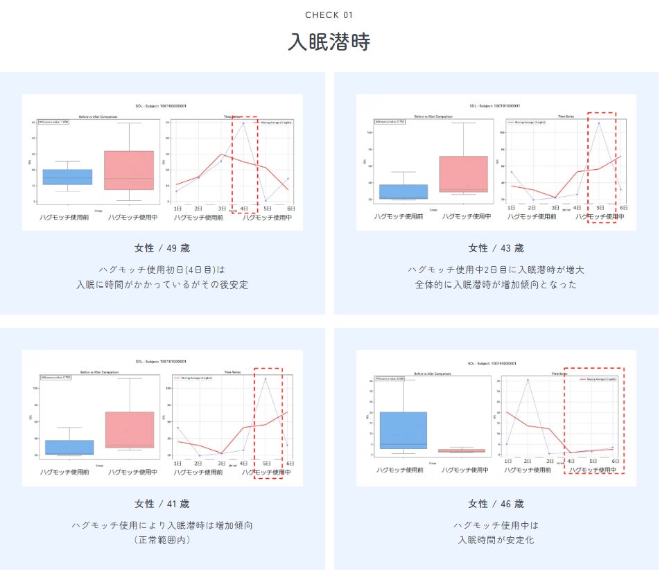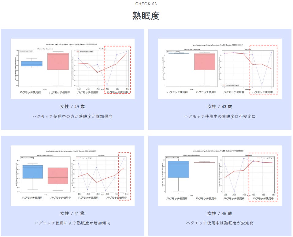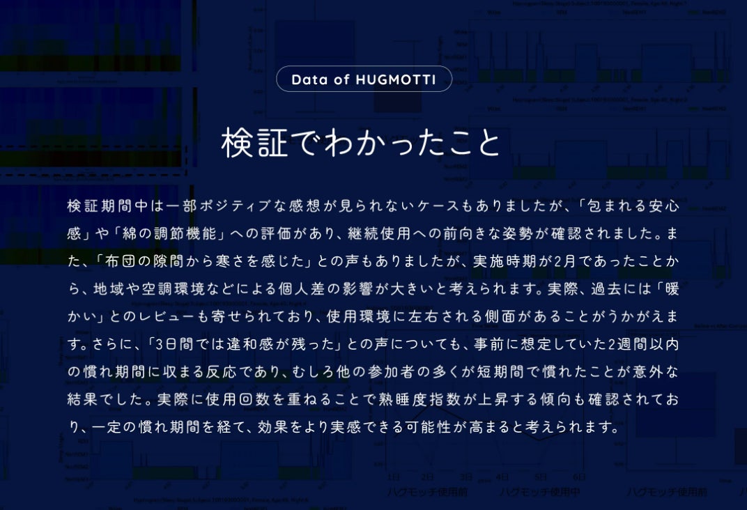 ・調査方法(集計方法、算出方法):PGV株式会社様が提供するパッチ式脳波測定機器を用いる。ハグモッチを活用せず3夜で測定後、次の3夜でハグモッチを使用した睡眠中の脳波測定を行う。
