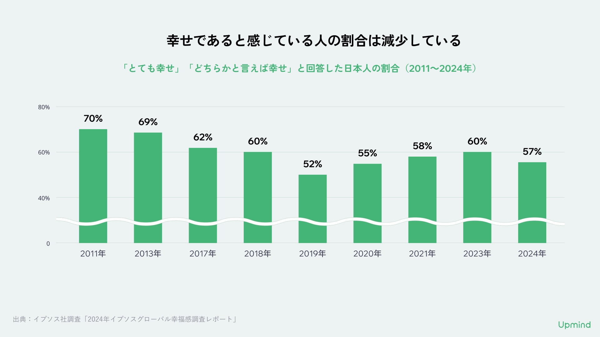 経済やテクノロジーの発展によって、生活の自由度・利便性が向上してきた現代ですが、幸福度調査によれば、幸せに感じている人の割合は横ばい、もしくは減少傾向にあります。