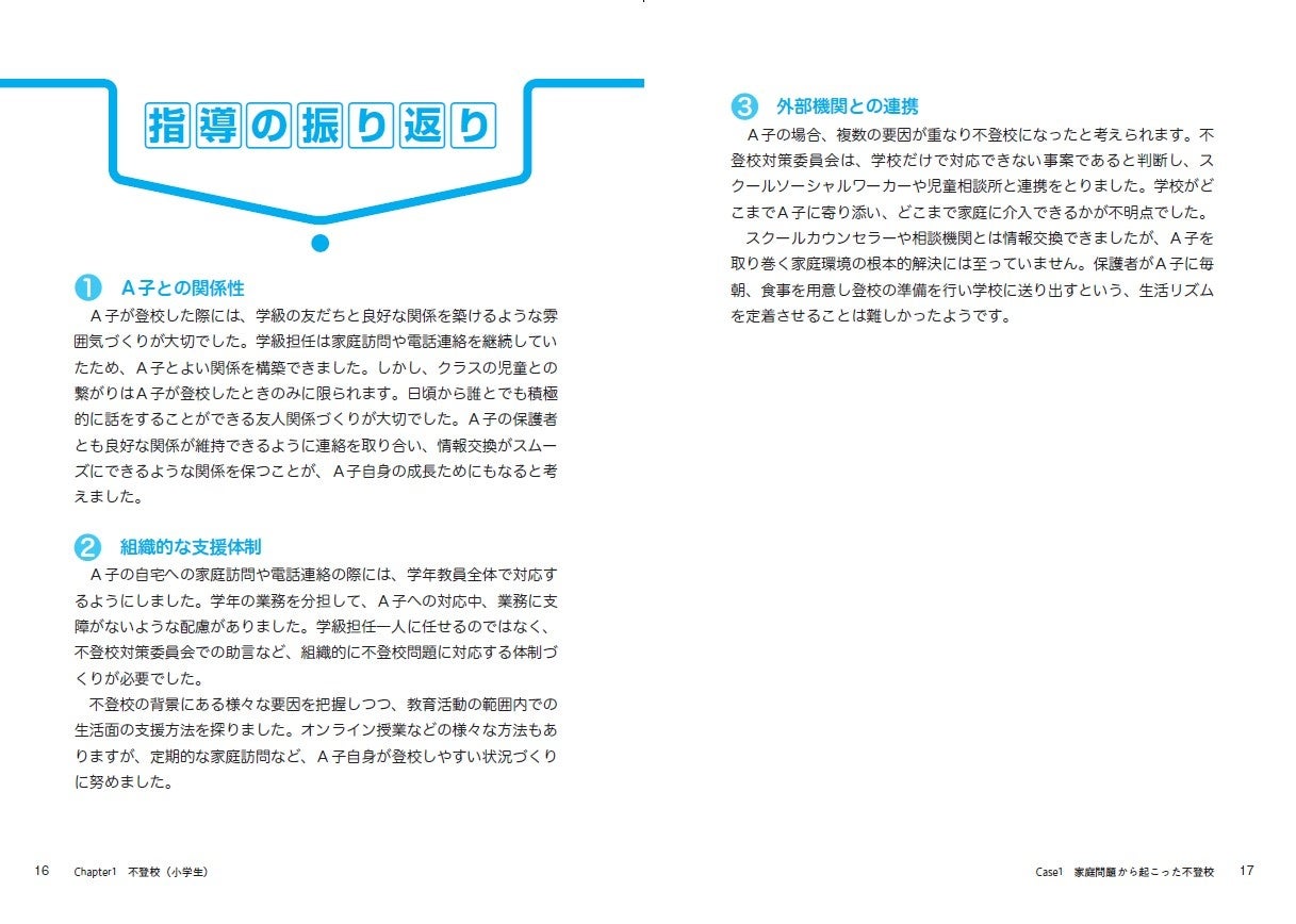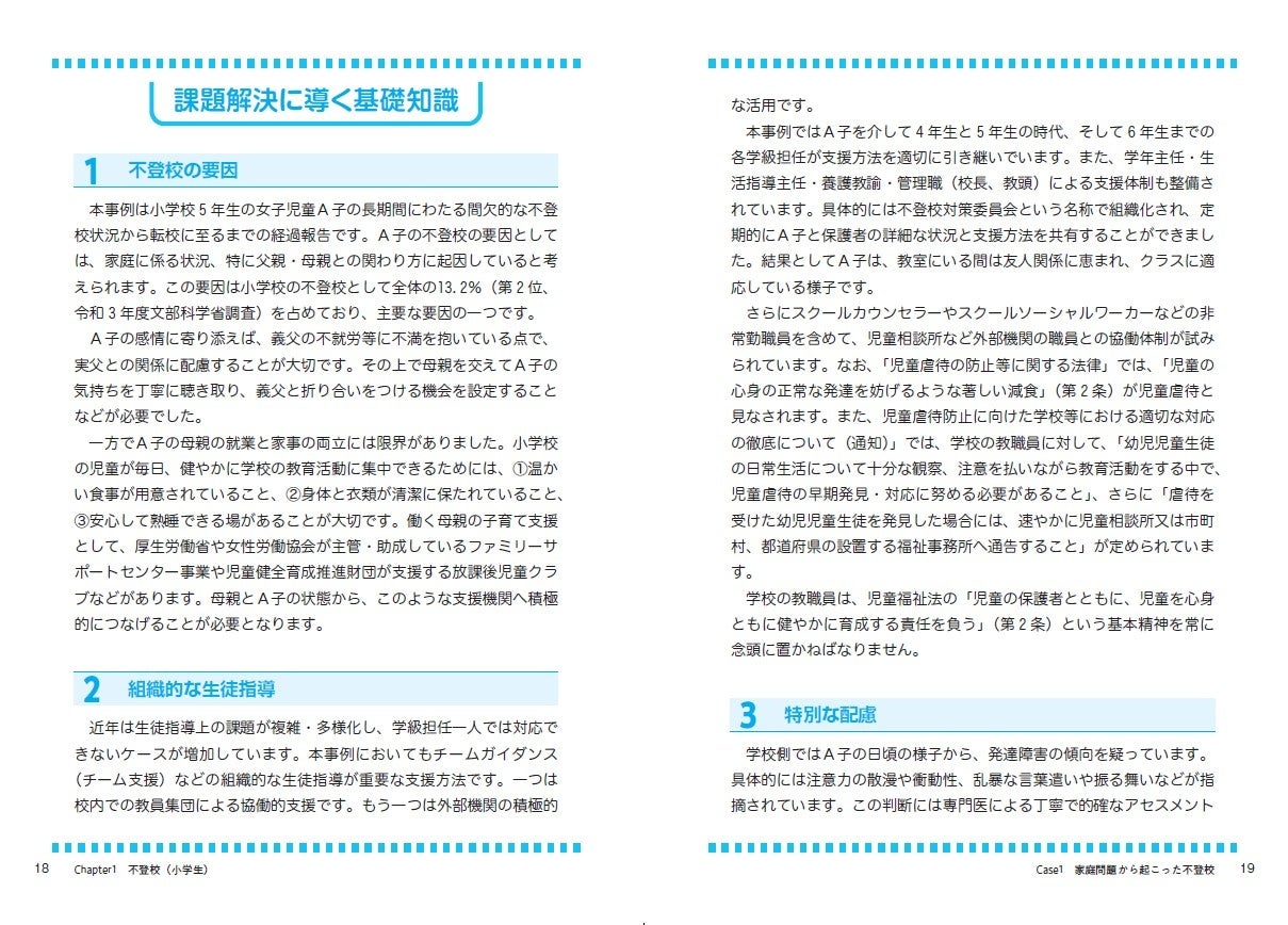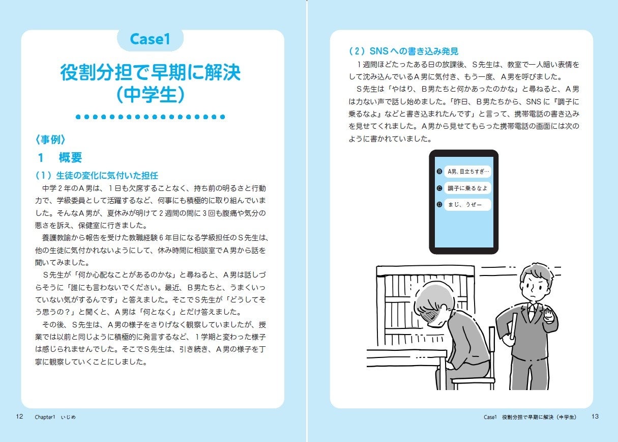 本書で紹介した事例は、各学校で起こる可能性のあるものを選び、その指導過程にスポットを当てて、詳しい解説を付けました。成功事例だけでなく、指導課題が残る事例もありますが、解説を読んで参考にしていただければ幸いです。