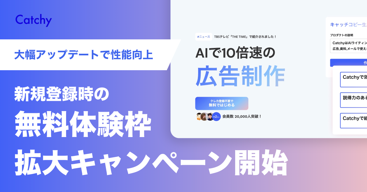 国内最大級AIライティングアシスタントサービス「Catchy」の性能向上をいち早く体験していただくために、2週間限定で新規登録時の無料体験枠を拡大します