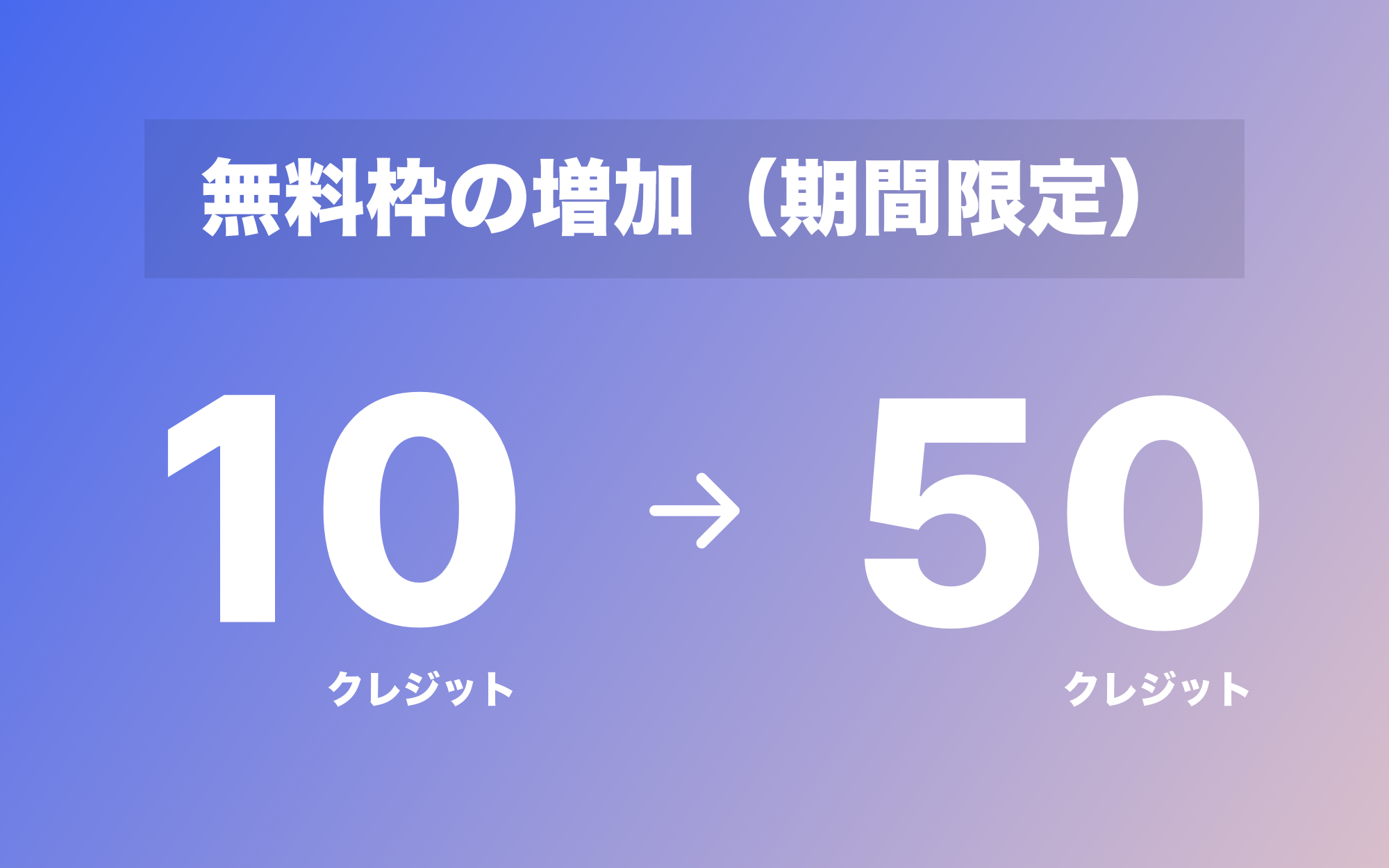 この性能をいち早く皆様に体験していただくために、2022年11月30日 AM 08:00 以降に新規登録をされる方の無料クレジット(※)を 10 から 50 に増やすことを決定しました。12月14日(水)までの期間限定キャンペーンとなります。