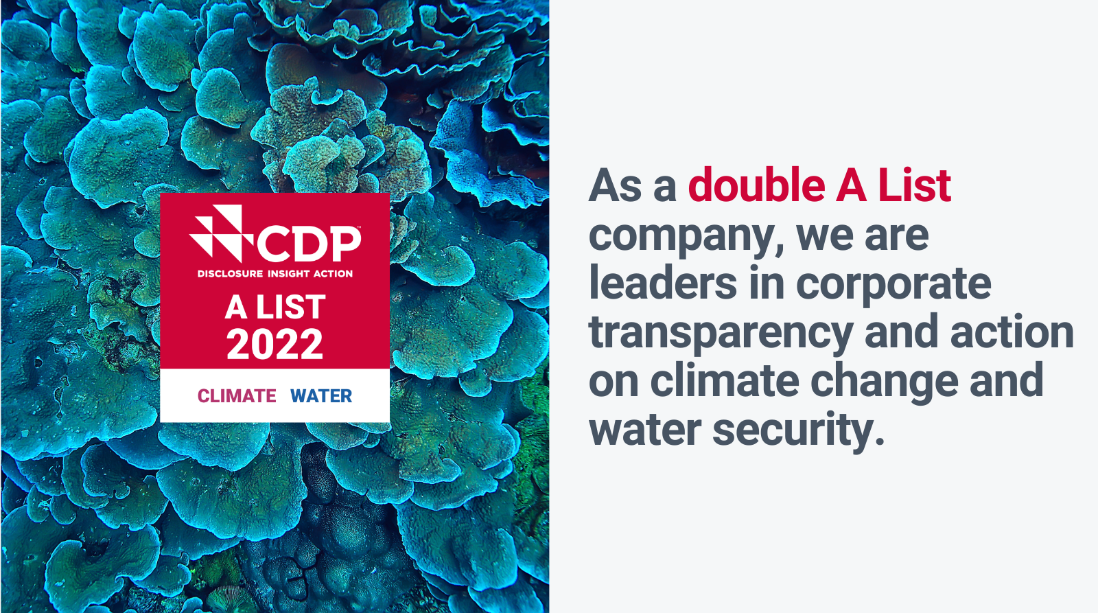 評価はCDPの2022年気候変動および水セキュリティ対応調査を通じて提出したデータに基づいて行われ、当社は1万社を超えるスコアリング対象企業のうち少数のみが認められたダブルAスコアを獲得しました。