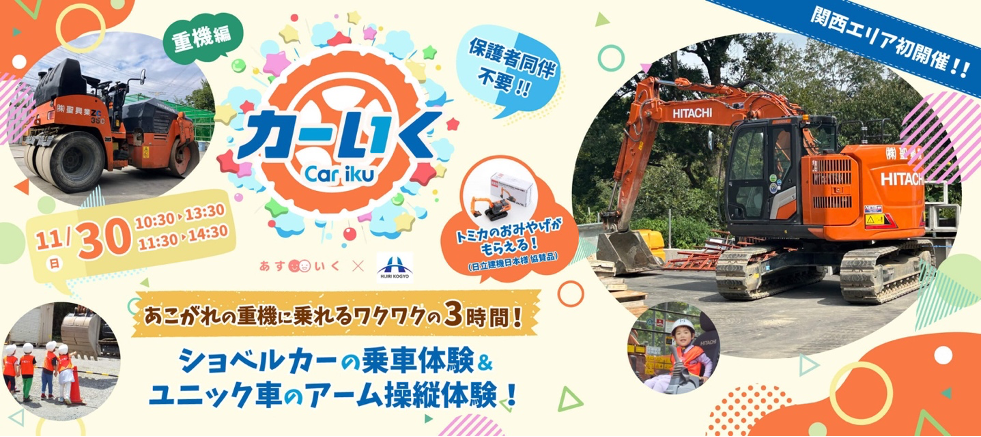 一時保育検索・予約サービス「あすいく」を運営する株式会社あすいく(本社:東京都港区、代表取締役:幸脇 啓子)は、体験型一時保育プログラム「カーいく」の新企画を2025年11月30日(日)に関西エリアでは初となる聖興業堺営業所にて開催します。また本企画は、今年10月より始動した、大手重機・建設機械メーカーの日立建機株式会社(本社:東京都台東区、執行役社長:先崎正文、以下「日立建機」)との協創プロジェクトの第一弾となります。