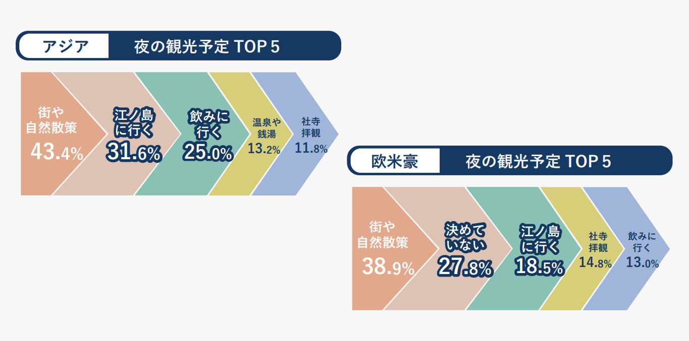 【鎌倉の夜観光、アジアと欧米豪の違いは?】アジア圏はアクティブに行動、「江の島に行く」「飲みに行く」が合わせて56.6%、欧米圏は流動的、「決めていない」が約3割