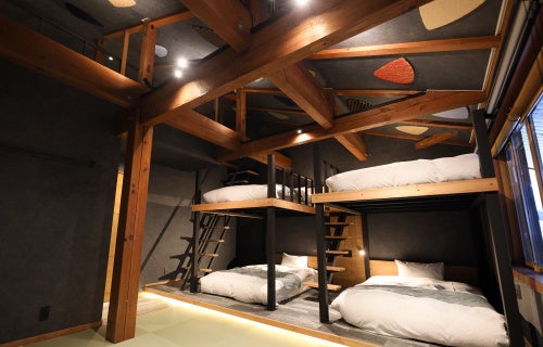 本館2階の客室は「和魂モダン」をコンセプトに和を和風というひとくくりにするのではなく、和の魂や気配を感じさせつつ、龍神温泉の特徴を取り入れ、現代的にアレンジした和の空間に仕上げました。黒を基調とした高天井に日本の伝統工芸である錦織を装飾として取り入れ、ラグジュアリーで力強い空間を演出。特に部屋中央に提灯をモチーフにした大きなライトを吊るした部屋は、伝統とモダンが融合したインパクトあるデザインです。また、最大6名様でご利用いただける広々とした客室には、ロフト付きの寝室やベッドが複数設置された部屋も完備。グループや家族旅行に最適でゆったりとした時間を楽しめます。各部屋には「暮空(ぼてん)」「宵空(よいあき)」など日本らしい空の名前を冠し、旅館らしい情緒を演出しています。