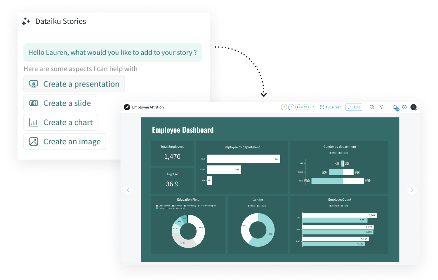 調査の回答者はまた、自社のチームがプレゼンテーションの構築と修正に費やす時間は、月平均で最大42時間、すなわち1週間分の業務に相当すると明らかにしました。Dataiku Storiesは、生成AIアシスタント機能によって、簡単なプロンプトでプレゼンテーション全体を瞬時に作成できるだけでなく、関連するデータポイントの提案や自動生成された画像によってコンテンツを再利用することもできます。Dataiku Storiesで作られた動的なプレゼンテーションは新しいデータで更新されるため、共有された後も正確で最新状態のプレゼンテーションが維持されます。