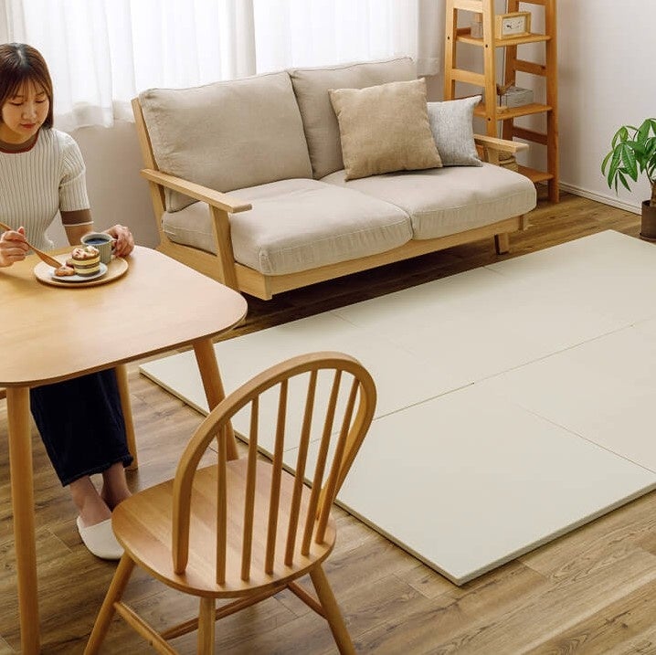 パステルカラーの樹脂パイプを使用し、市松模様に織り上げられた置き畳。い草と異なり、水や傷に強いのでお手入れしやすさもポイント。やわらかめの中材を使用しており、約2.5cmの厚みなので、キッズスペースにもオススメです。