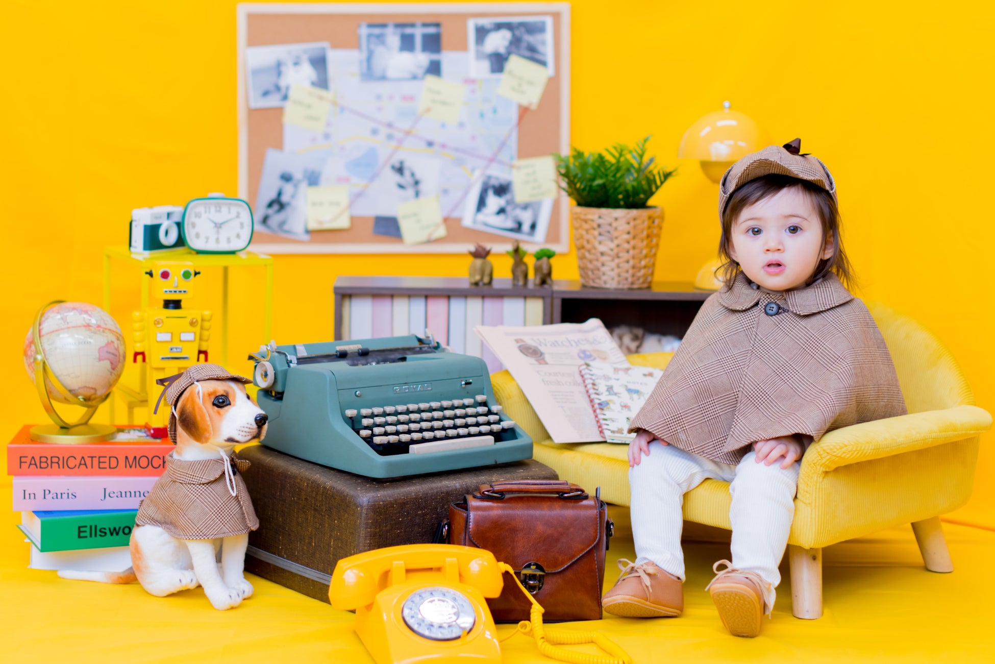 メインカラーにはビビットな黄色をチョイス。探偵事務所をイメージさせるビンテージのタイプライターやダイヤル式の電話など、懐かしさを感じさせる小物の数々で、映画のワンシーンのような写真が残せます